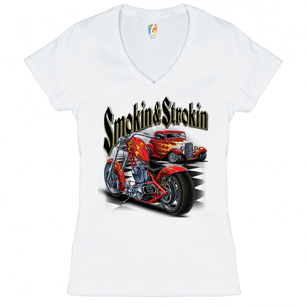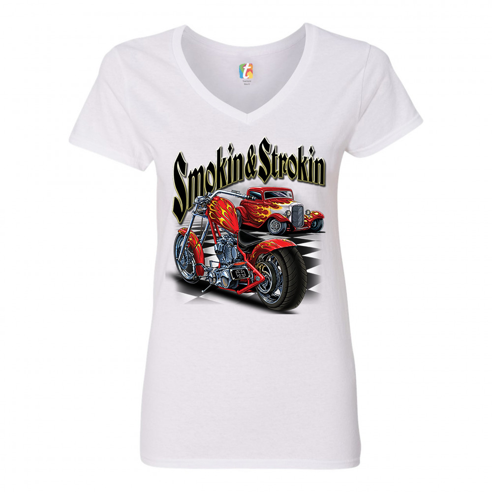 SMOKIN & STROKIN women's v-neck t-shirt chopper biker hot rod live to ride tee white