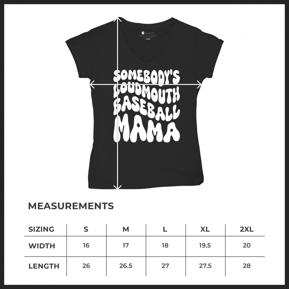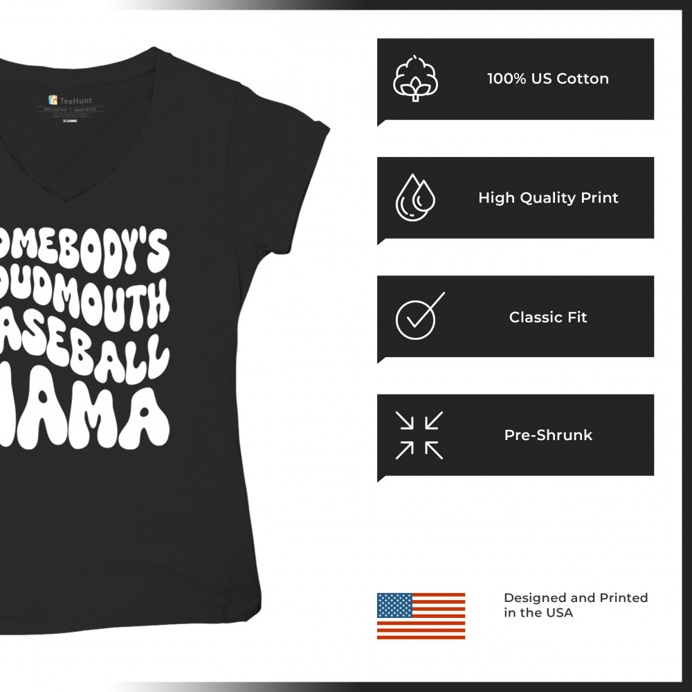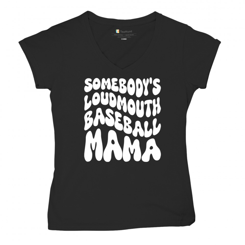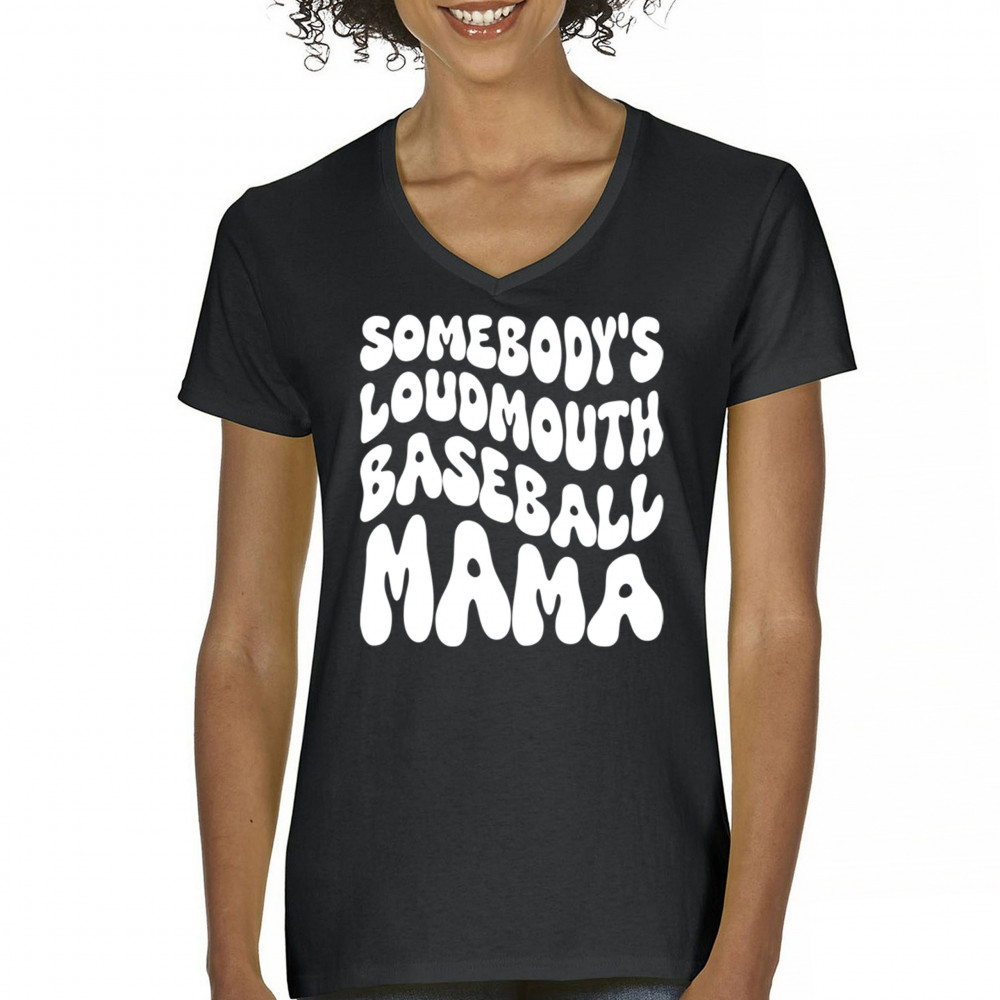 SOMEBODY'S LOUDMOUTH BASEBALL MAMA women's v-neck t-shirt proud mom funny tee black