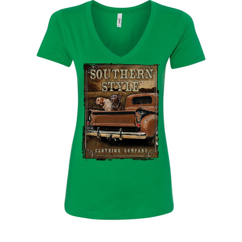 SOUTHERN STYLE women's v-neck t-shirt truck country farm labrador retriever green