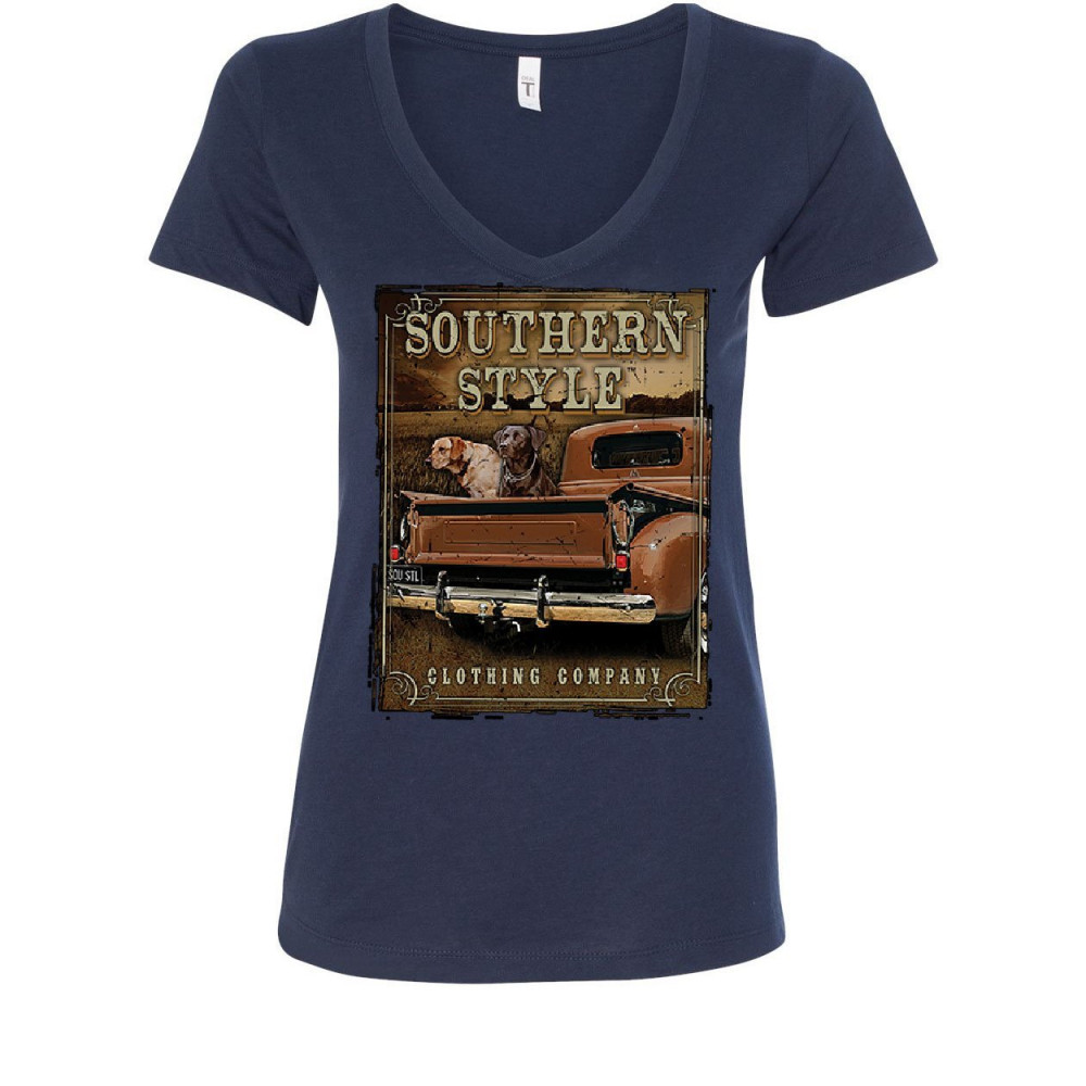 SOUTHERN STYLE women's v-neck t-shirt truck country farm labrador retriever navy blue