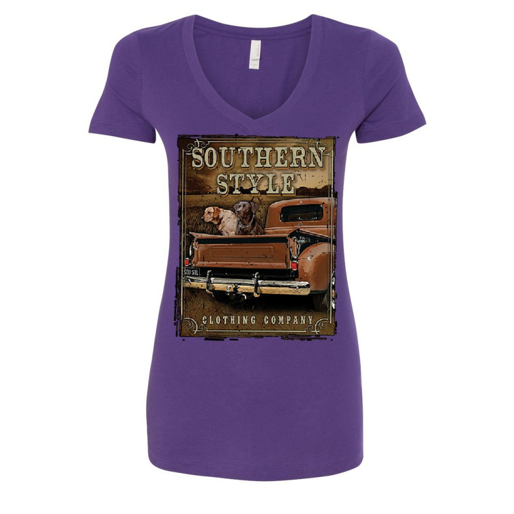 SOUTHERN STYLE women's v-neck t-shirt truck country farm labrador retriever purple