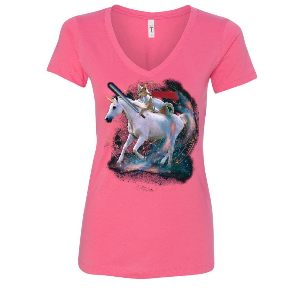 SPACE CAT RIDING A UNICORN with a saber women's v-neck t-shirt weird universe pink