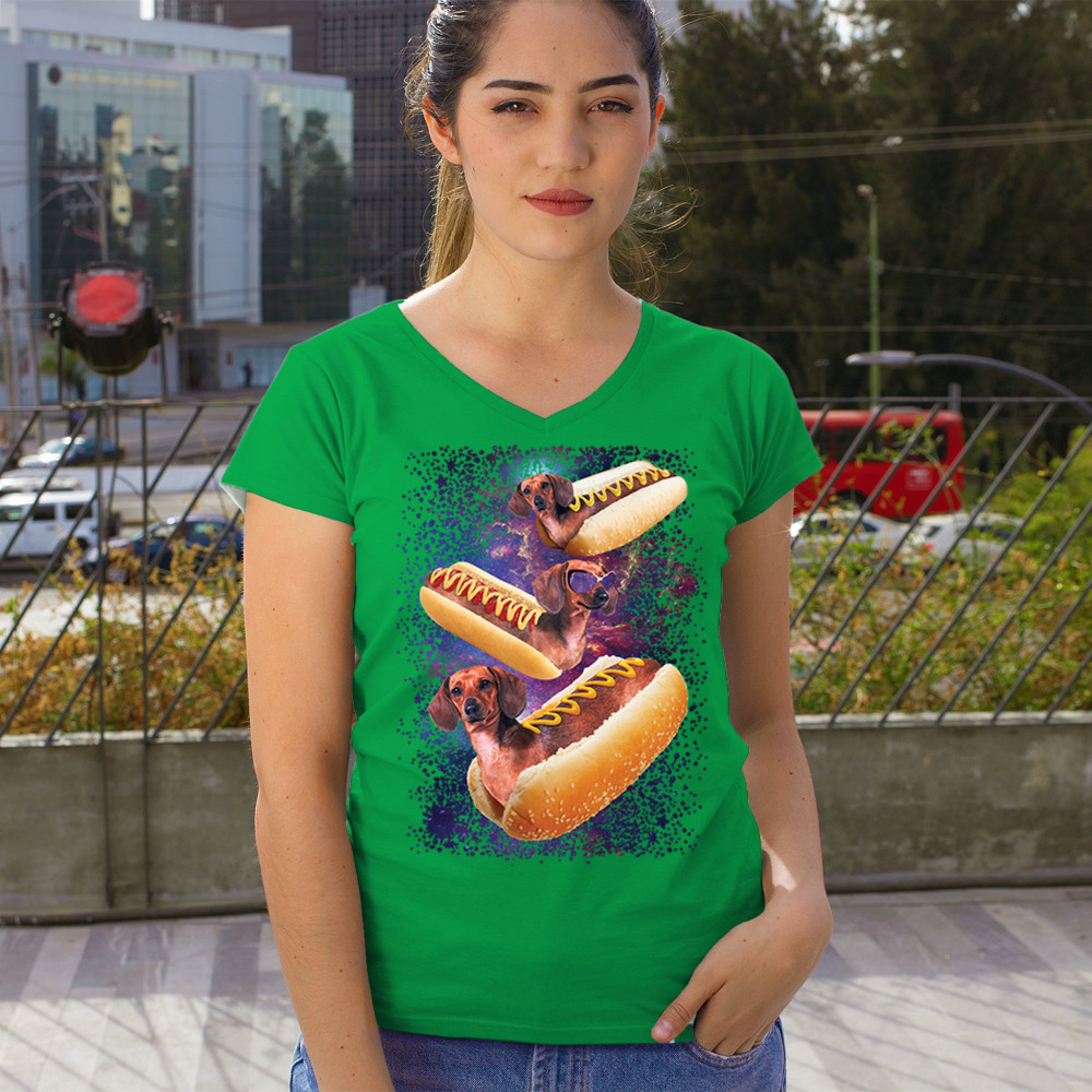 Add a dash of humor to your wardrobe with our unique design featuring adorable dachshunds as hotdogs in a cosmic setting. This playful graphic is perfect for animal lovers and those with a quirky sense of style. The vibrant colors and detailed illustration ensure you stand out in any crowd. Made from premium materials, this tee offers both comfort and durability, making it ideal for everyday wear or special occasions. Embrace your love for dogs and space with this fun and imaginative design.