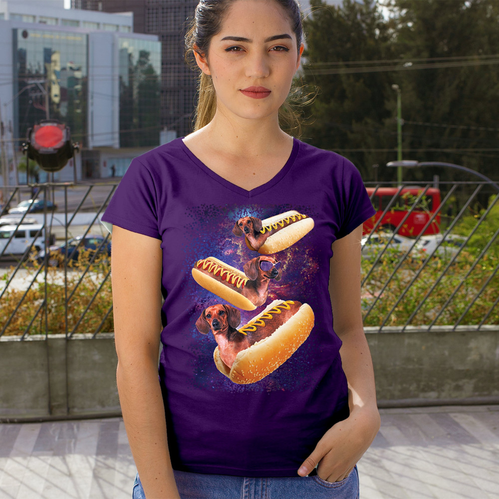 Add a dash of humor to your wardrobe with our unique design featuring adorable dachshunds as hotdogs in a cosmic setting. This playful graphic is perfect for animal lovers and those with a quirky sense of style. The vibrant colors and detailed illustration ensure you stand out in any crowd. Made from premium materials, this tee offers both comfort and durability, making it ideal for everyday wear or special occasions. Embrace your love for dogs and space with this fun and imaginative design.