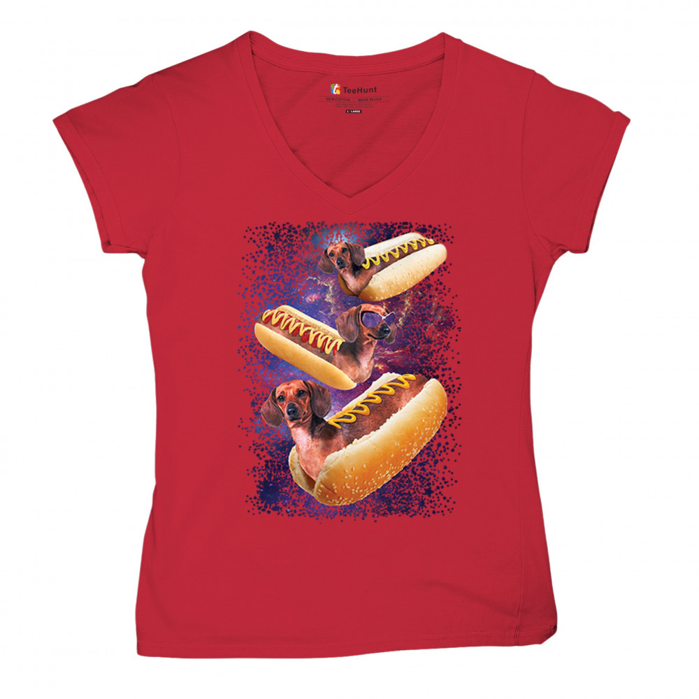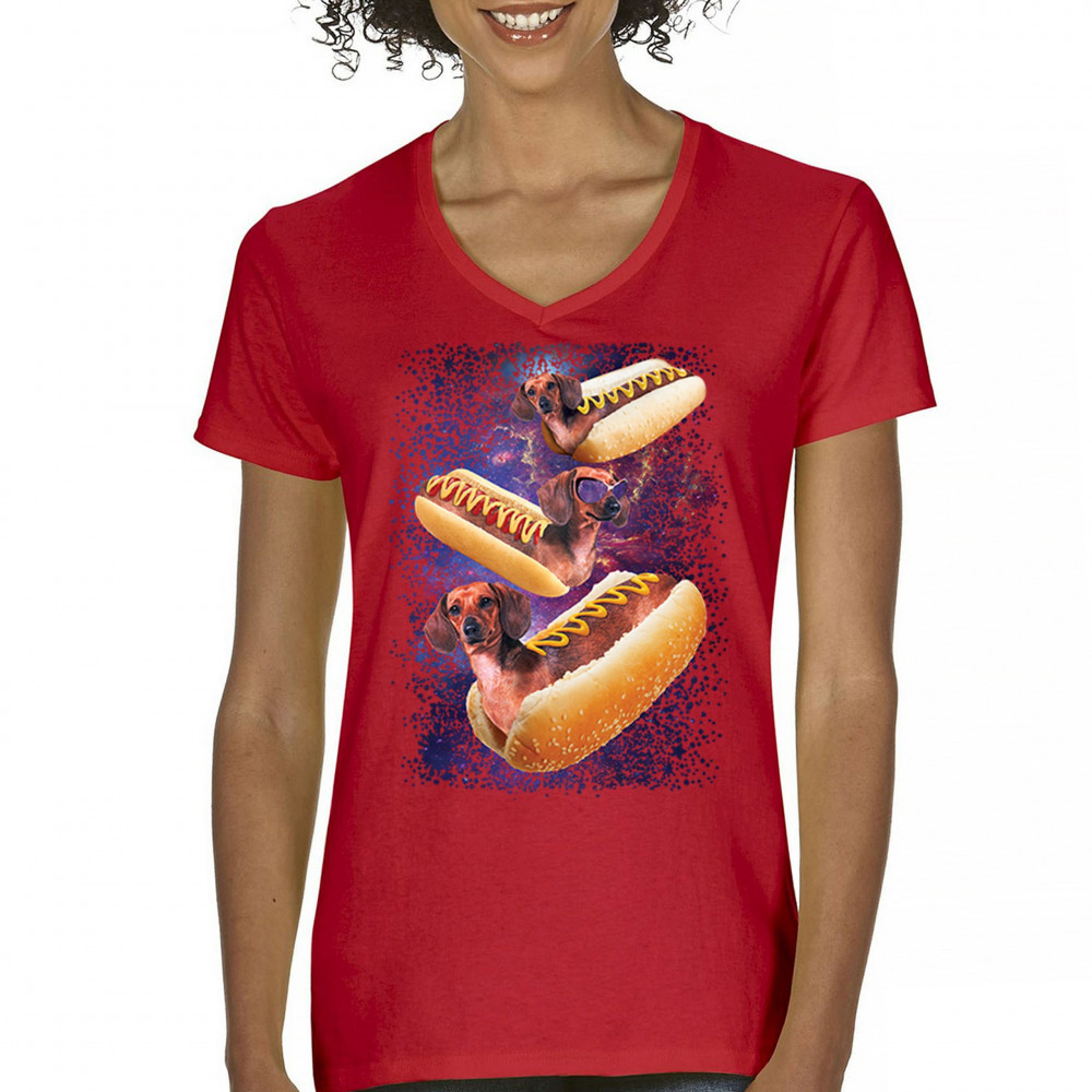 Quirky and fun tee featuring dachshunds as hotdogs in a cosmic setting. Perfect for dog and space lovers. Comfortable and durable.