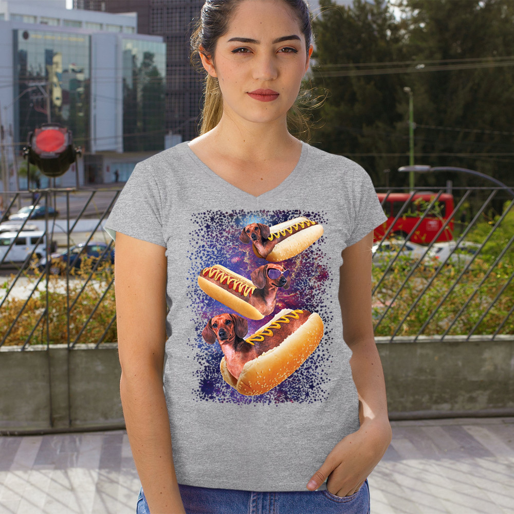 Add a dash of humor to your wardrobe with our unique design featuring adorable dachshunds as hotdogs in a cosmic setting. This playful graphic is perfect for animal lovers and those with a quirky sense of style. The vibrant colors and detailed illustration ensure you stand out in any crowd. Made from premium materials, this tee offers both comfort and durability, making it ideal for everyday wear or special occasions. Embrace your love for dogs and space with this fun and imaginative design.