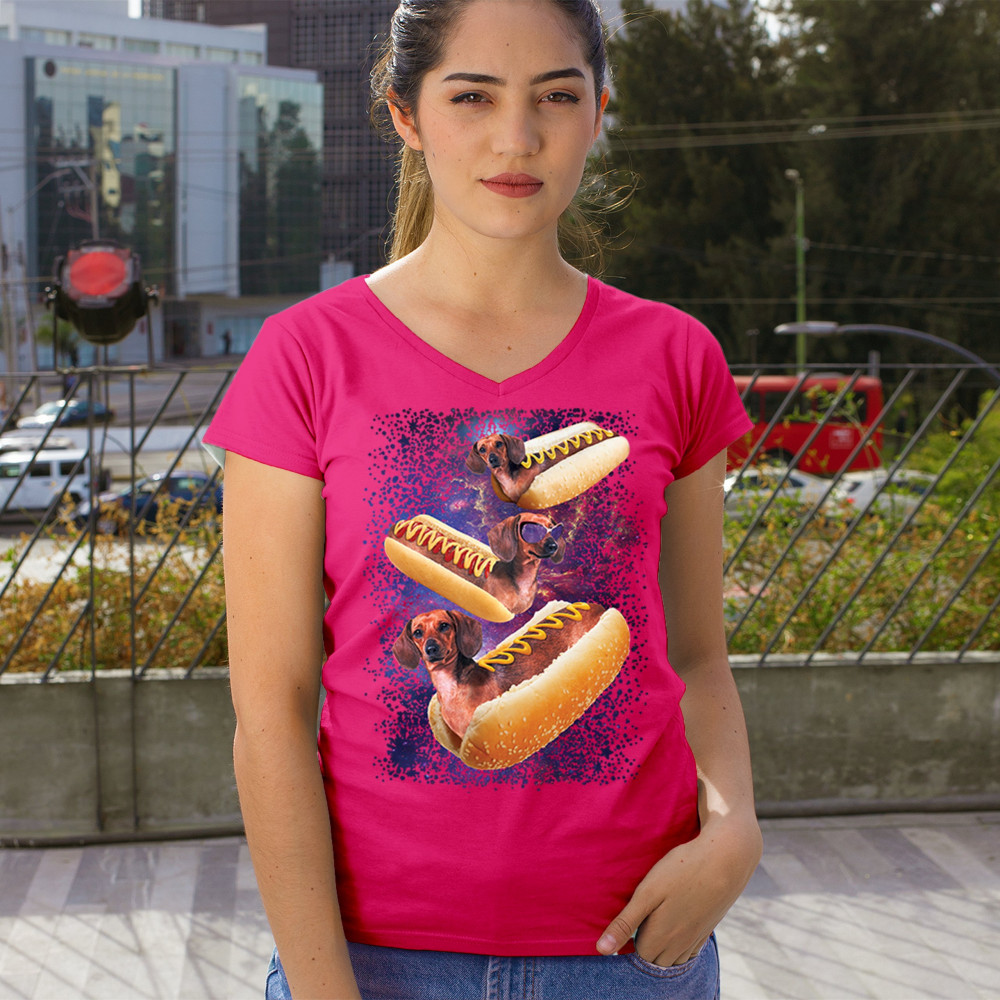 Add a dash of humor to your wardrobe with our unique design featuring adorable dachshunds as hotdogs in a cosmic setting. This playful graphic is perfect for animal lovers and those with a quirky sense of style. The vibrant colors and detailed illustration ensure you stand out in any crowd. Made from premium materials, this tee offers both comfort and durability, making it ideal for everyday wear or special occasions. Embrace your love for dogs and space with this fun and imaginative design.