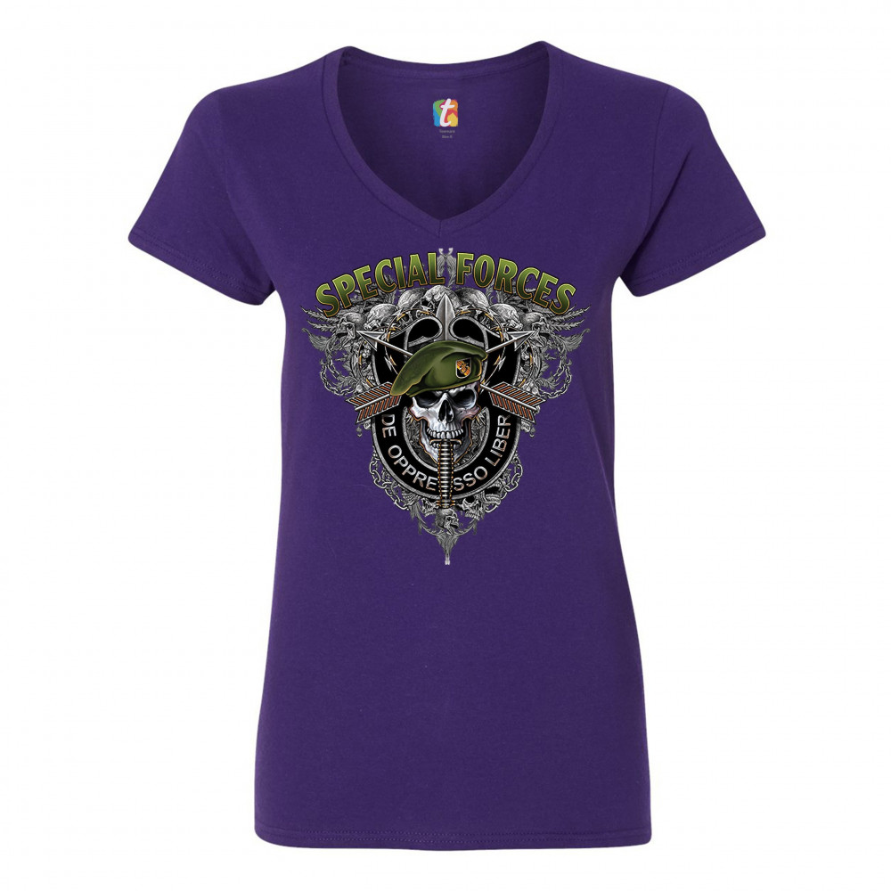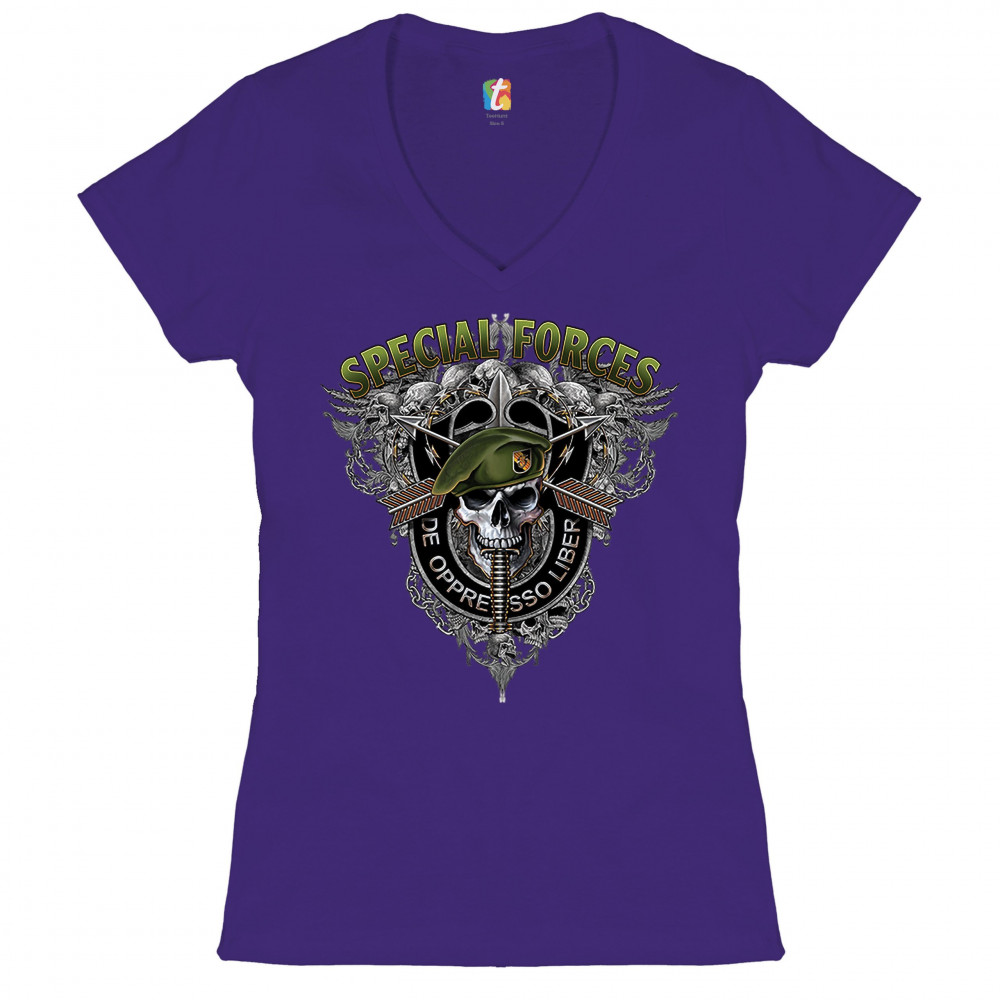 A patriotic print featuring a skull wearing a green beret with a dagger in it's mouth. At the top the print says: "Special Forces". Around the skull there is a black stripe with the special forces' slogan written on it: "de oppresso liber". In the backgro