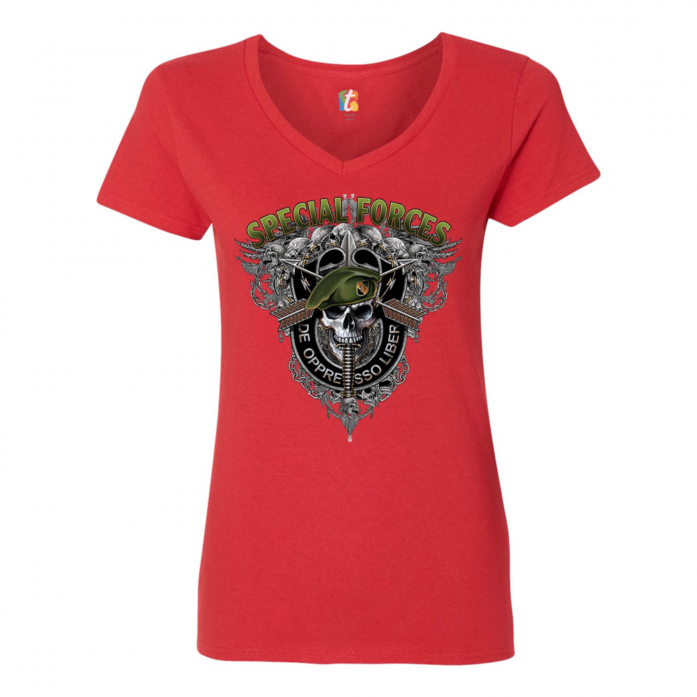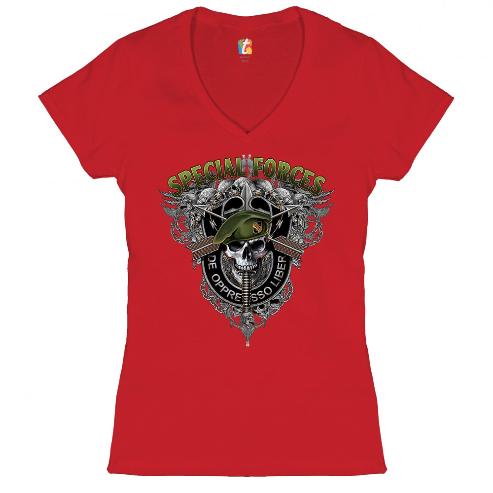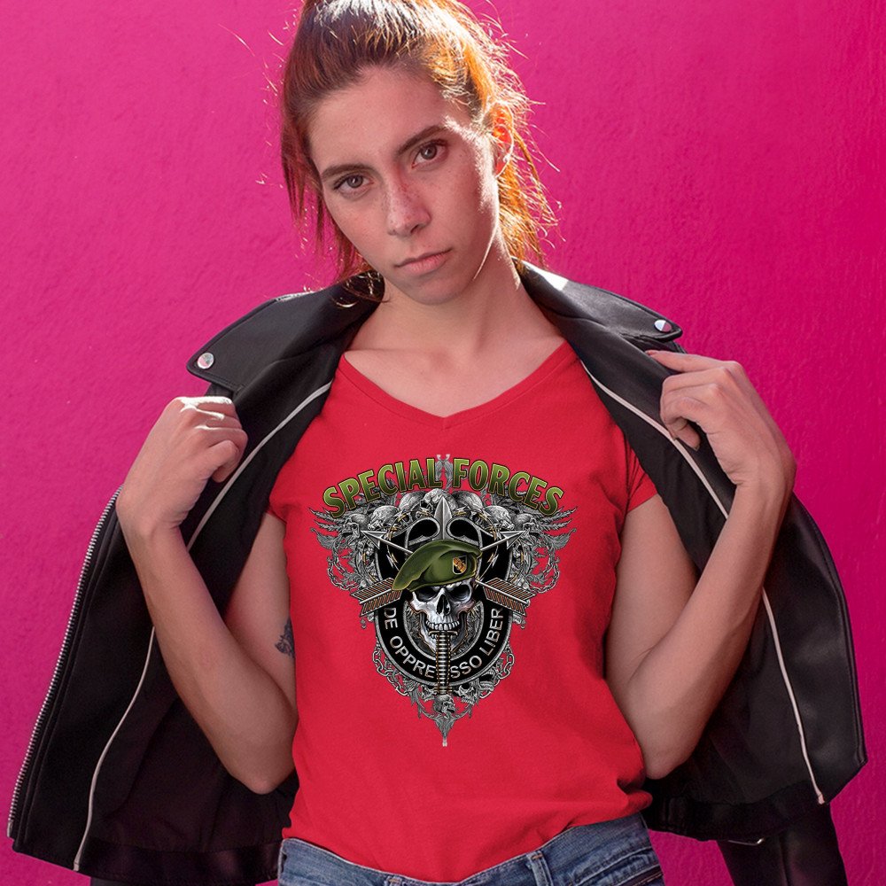 A patriotic print featuring a skull wearing a green beret with a dagger in it's mouth. At the top the print says: "Special Forces". Around the skull there is a black stripe with the special forces' slogan written on it: "de oppresso liber". In the backgro