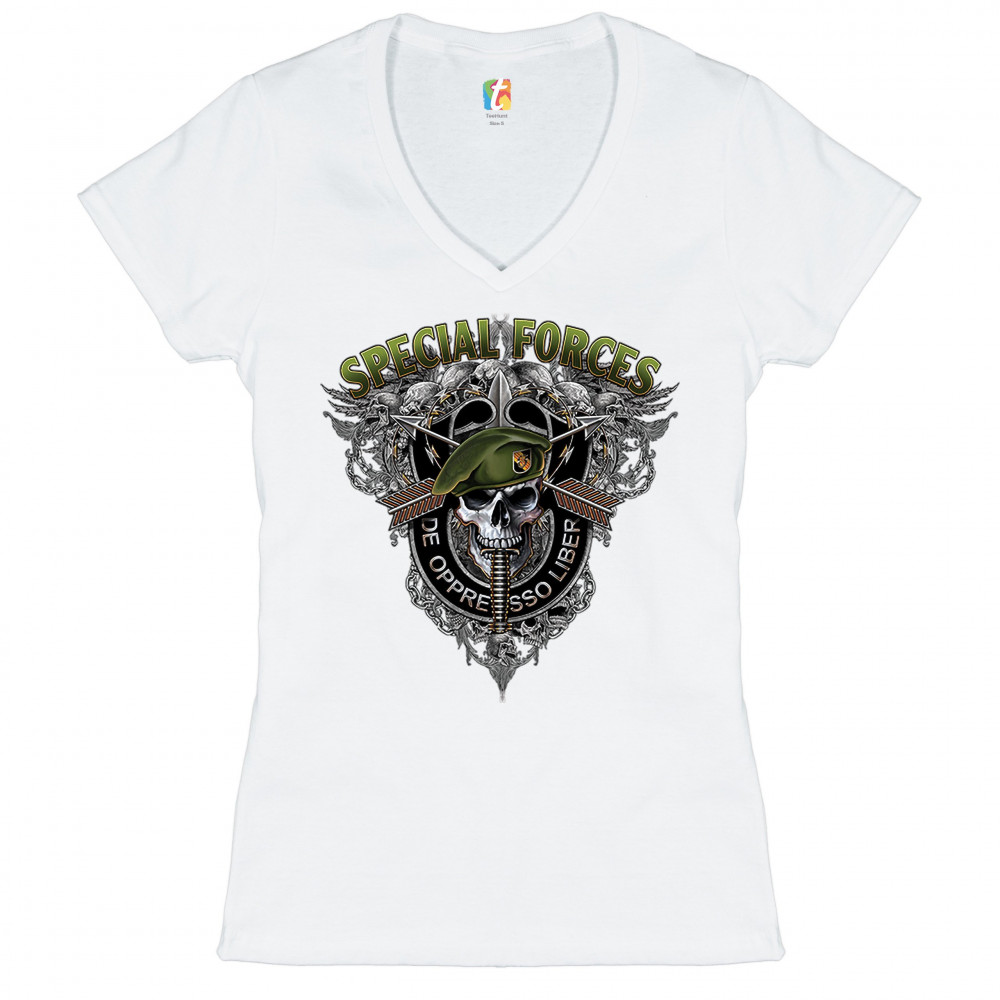 A patriotic print featuring a skull wearing a green beret with a dagger in it's mouth. At the top the print says: "Special Forces". Around the skull there is a black stripe with the special forces' slogan written on it: "de oppresso liber". In the backgro