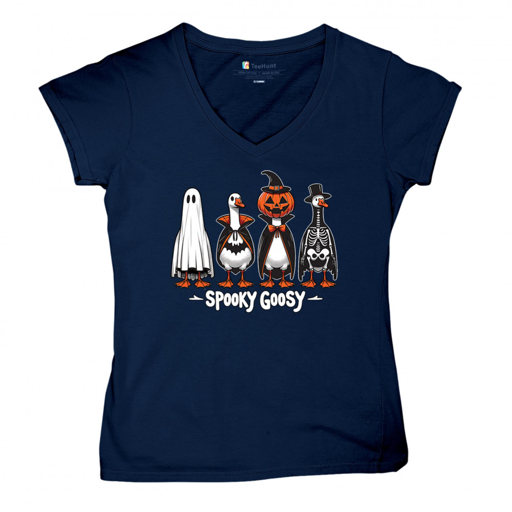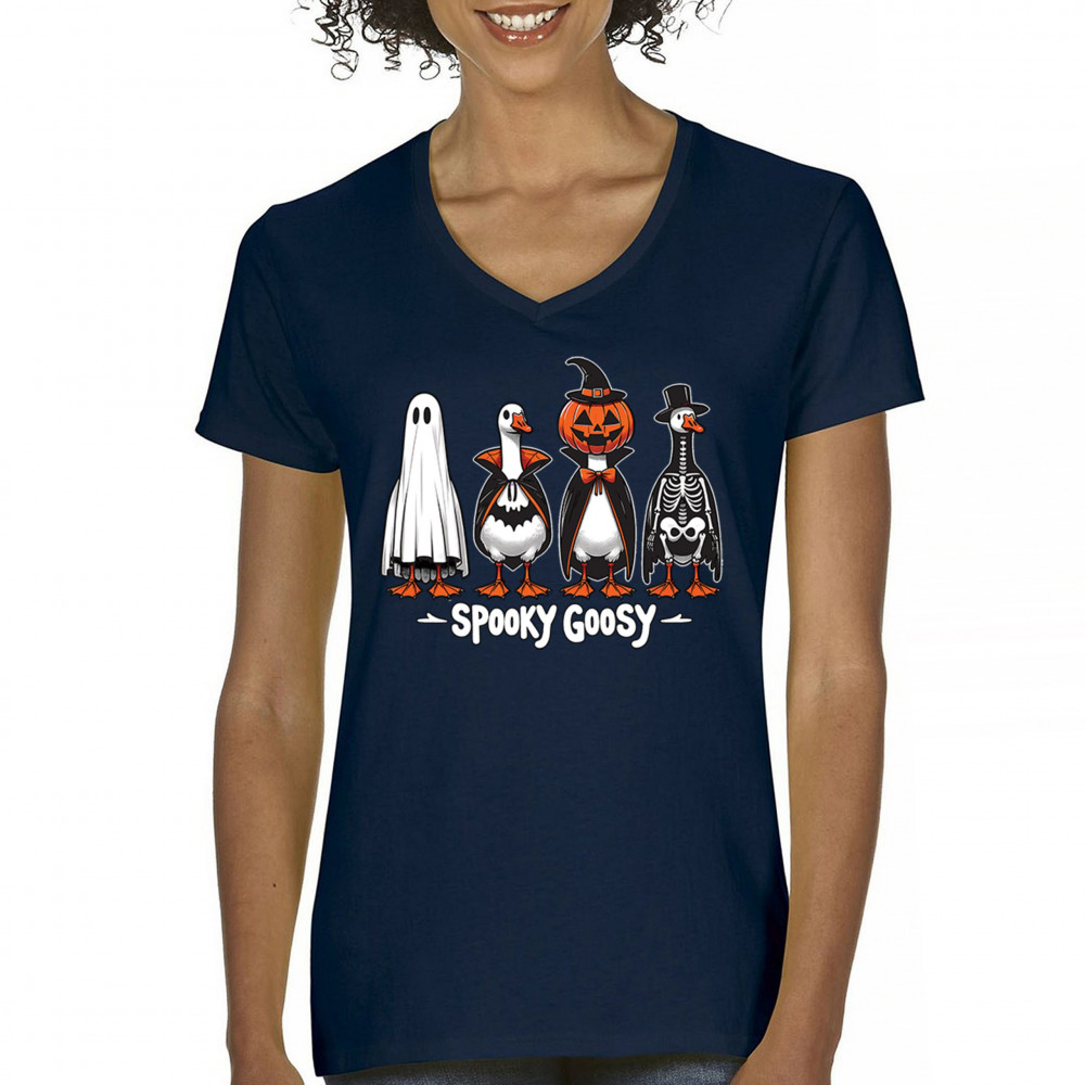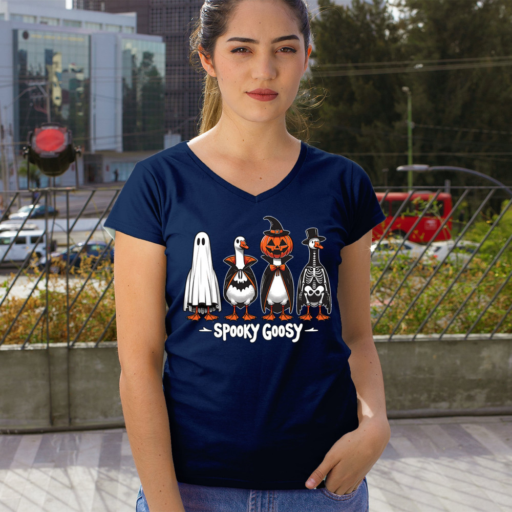 Spooky Goosy Halloween design with geese in witch, skeleton, vampire, and pumpkin costumes. Perfect for October 31, haunted house, and scary night fun.