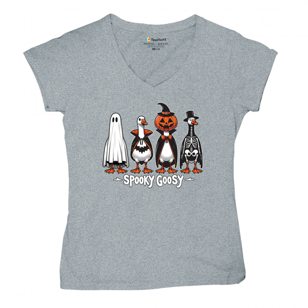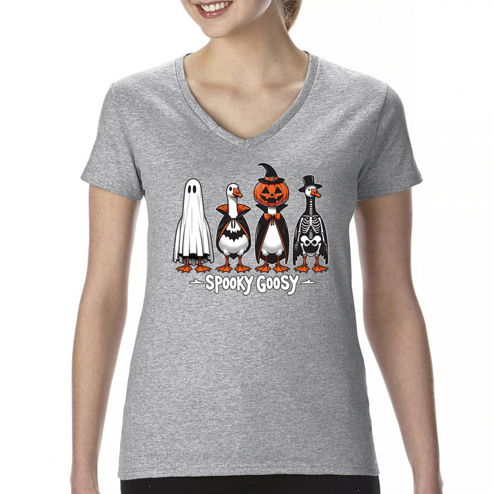Spooky Goosy Halloween design with geese in witch, skeleton, vampire, and pumpkin costumes. Perfect for October 31, haunted house, and scary night fun.