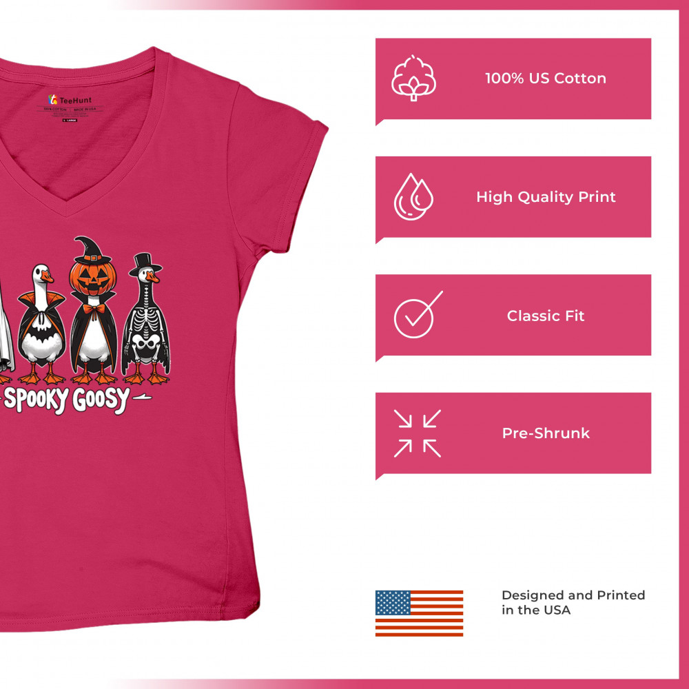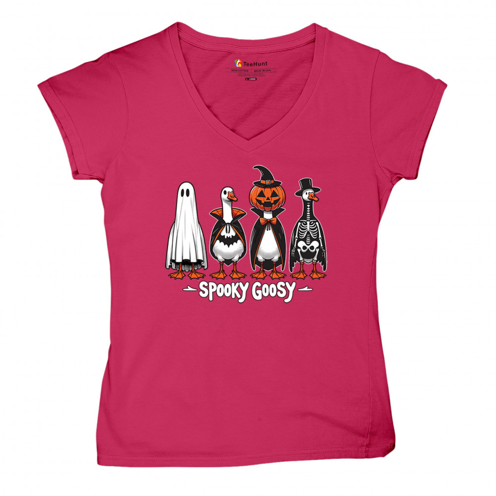 Spooky Goosy Halloween design with geese in witch, skeleton, vampire, and pumpkin costumes. Perfect for October 31, haunted house, and scary night fun.