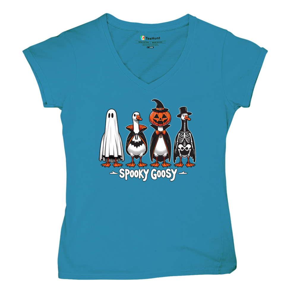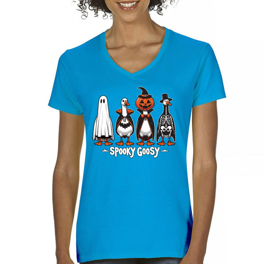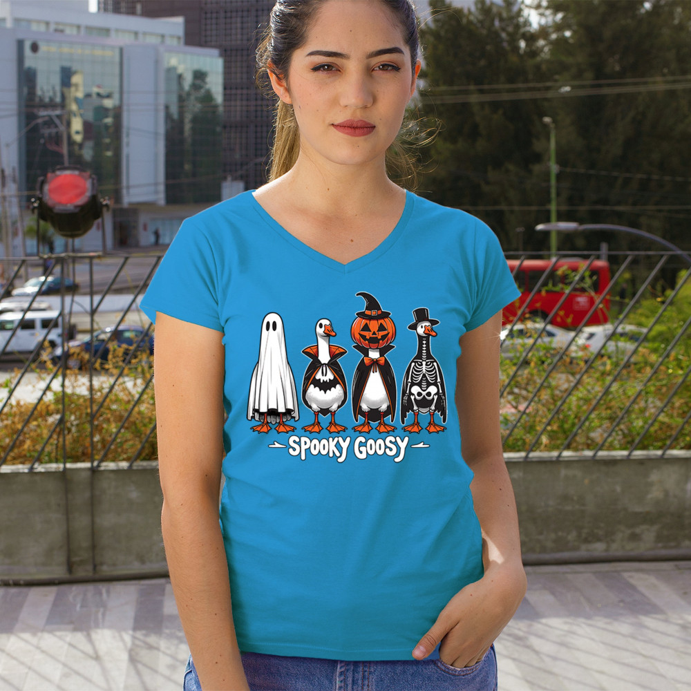 Spooky Goosy Halloween design with geese in witch, skeleton, vampire, and pumpkin costumes. Perfect for October 31, haunted house, and scary night fun.
