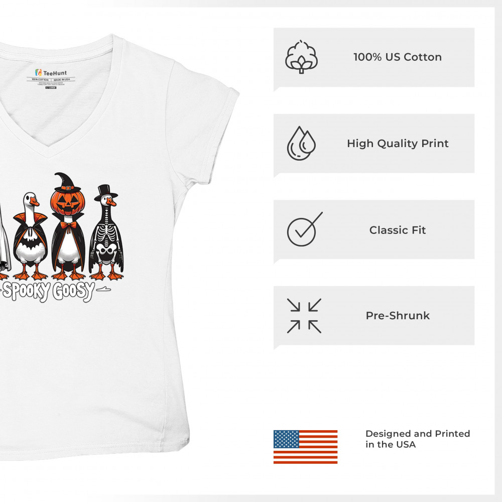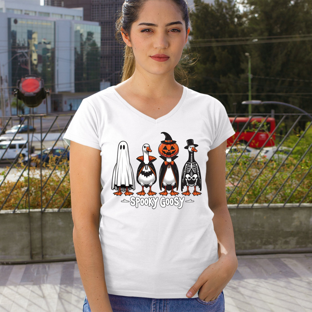 Spooky Goosy Halloween design with geese in witch, skeleton, vampire, and pumpkin costumes. Perfect for October 31, haunted house, and scary night fun.