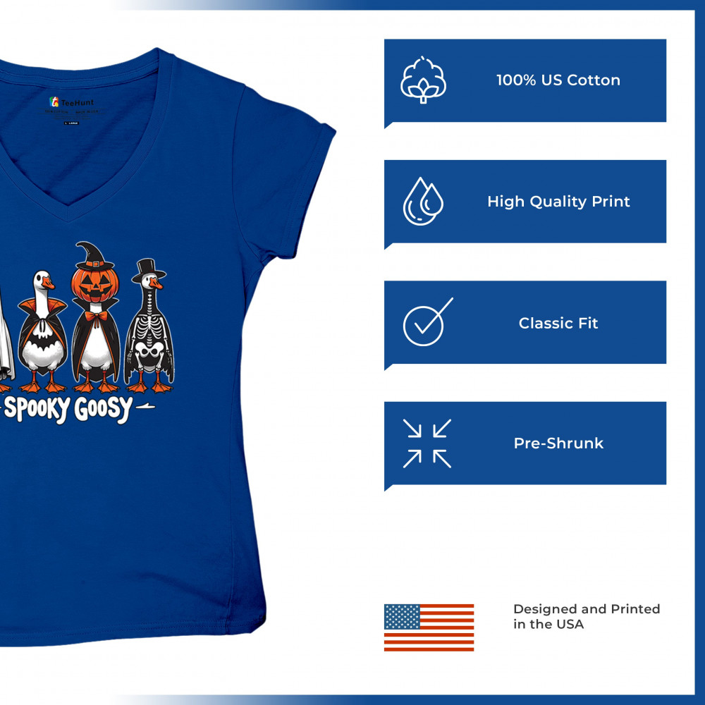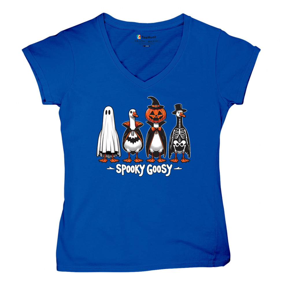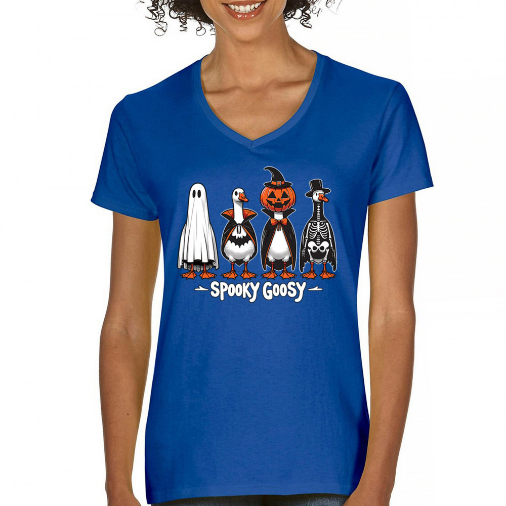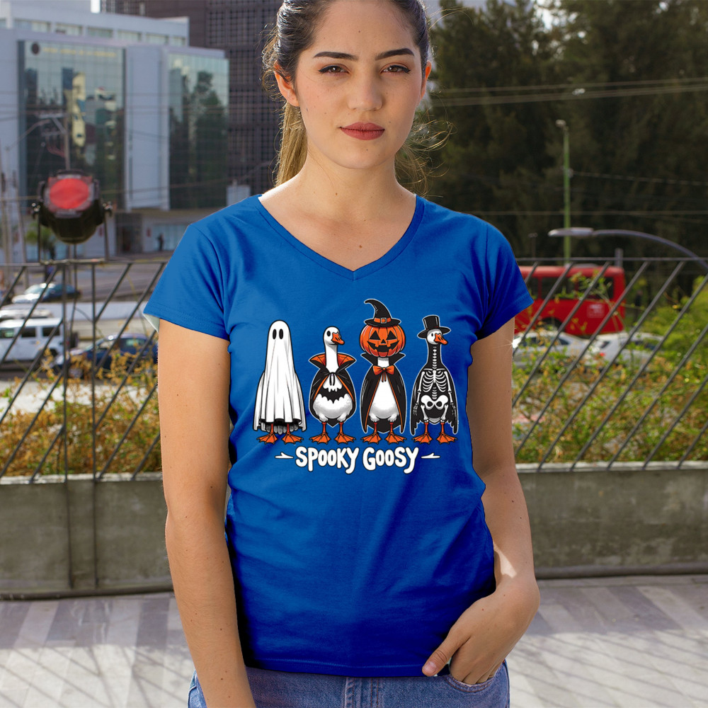 Spooky Goosy Halloween design with geese in witch, skeleton, vampire, and pumpkin costumes. Perfect for October 31, haunted house, and scary night fun.