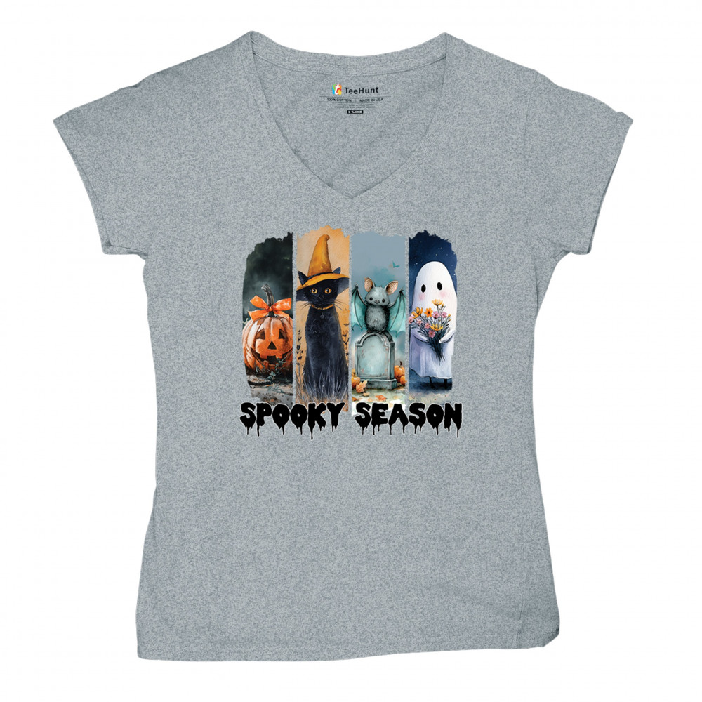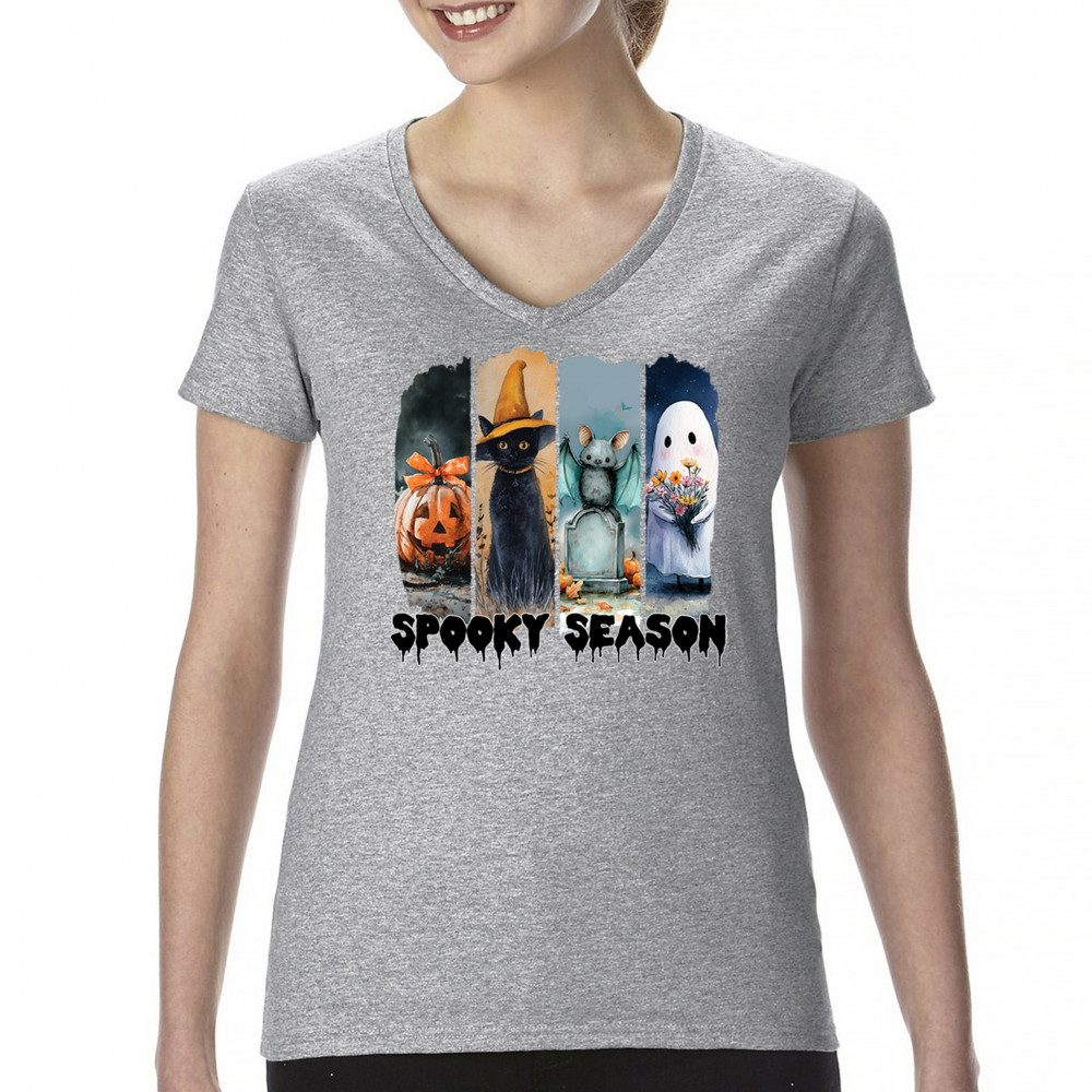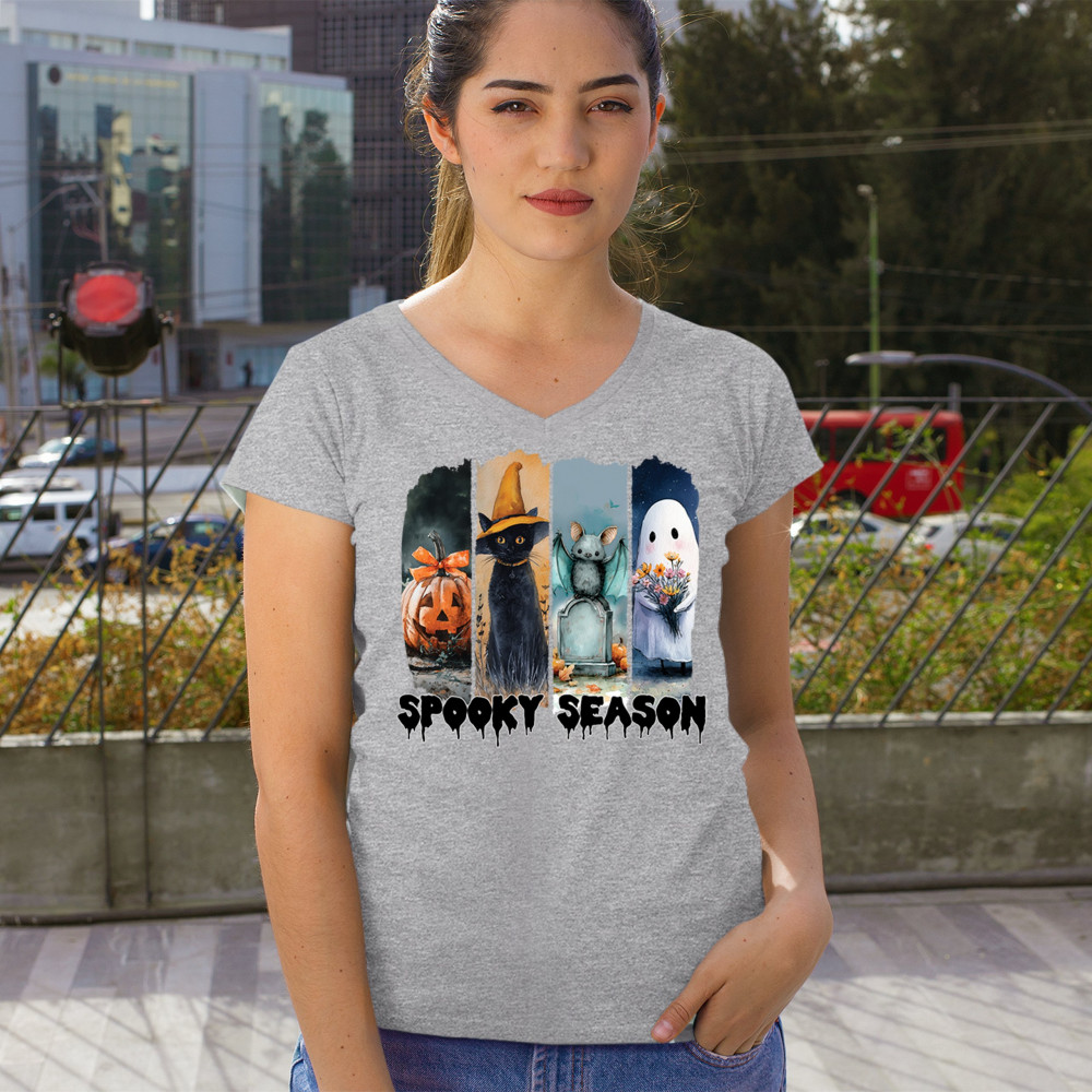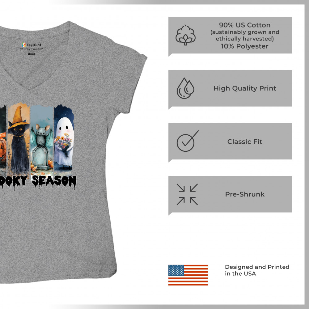 Spooky Season design with scary black cat, jack o lantern, haunted ghost house, and cute ghost. Perfect for October 31, trick or treat, and fall fun.