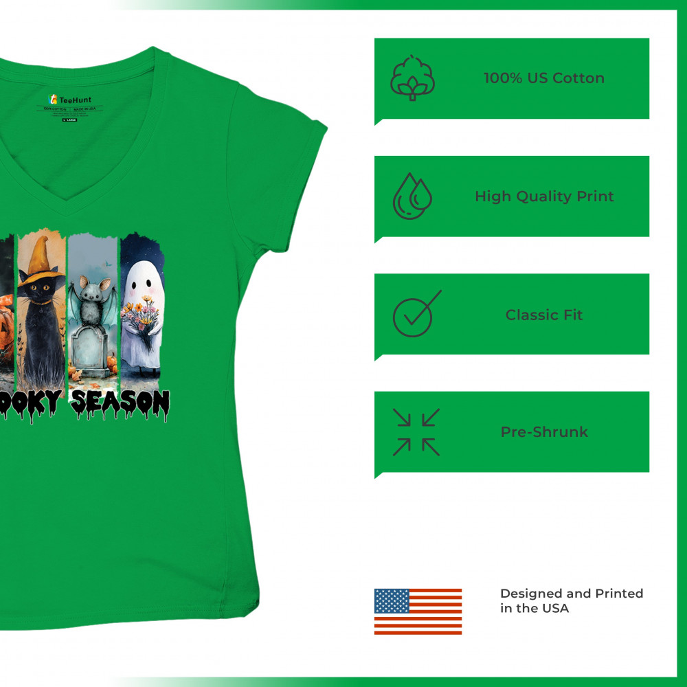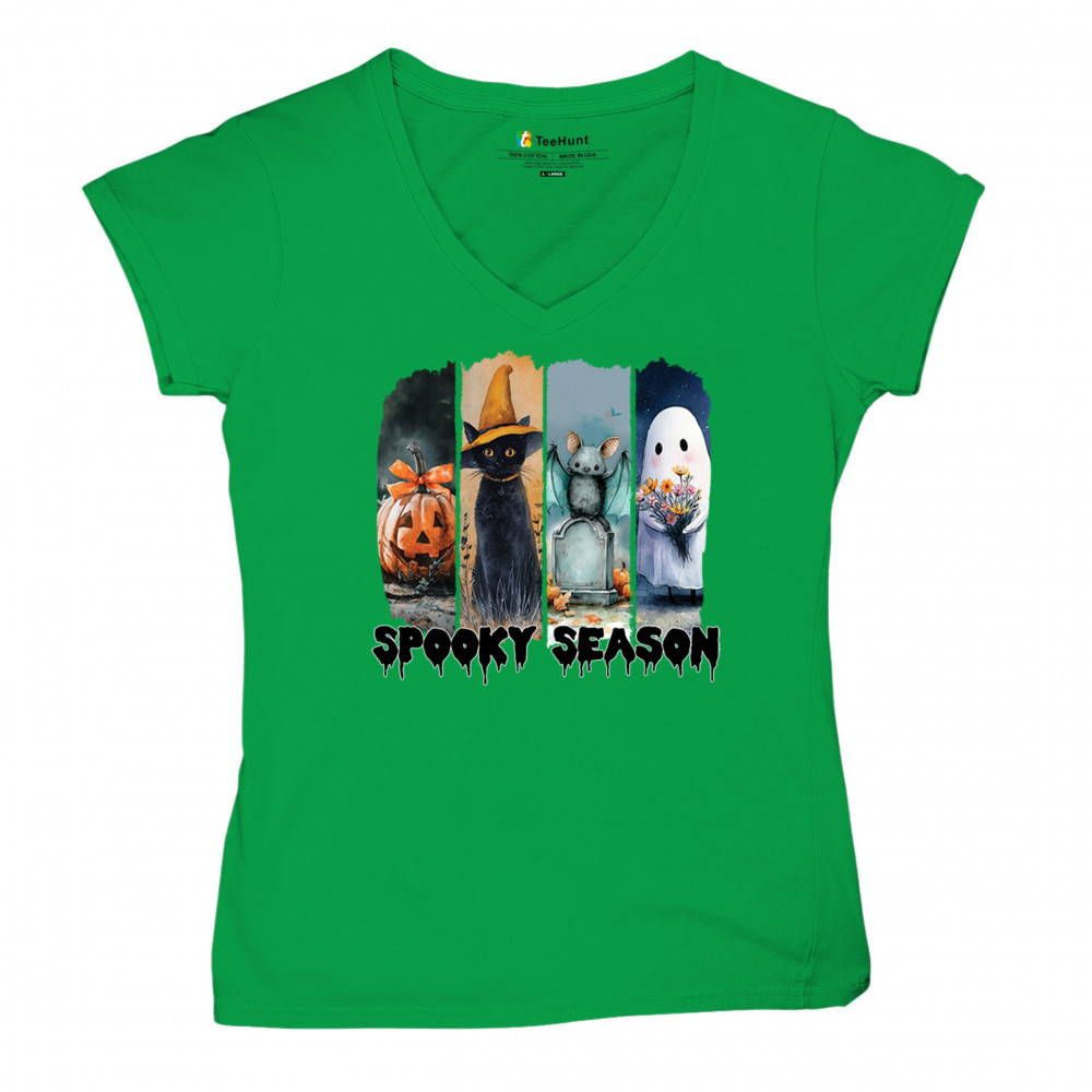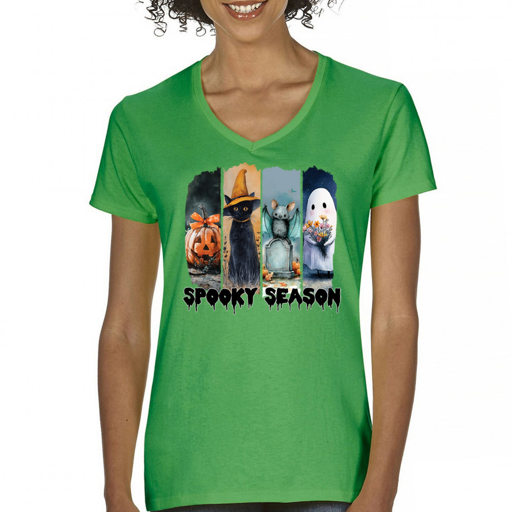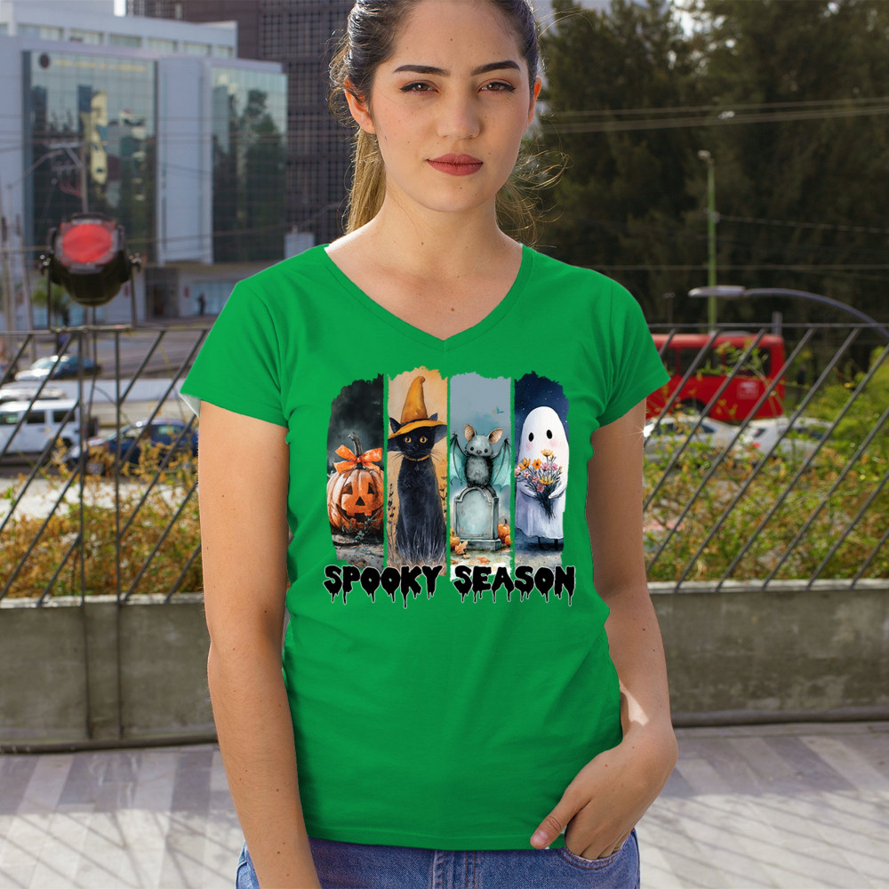 Spooky Season design with scary black cat, jack o lantern, haunted ghost house, and cute ghost. Perfect for October 31, trick or treat, and fall fun.
