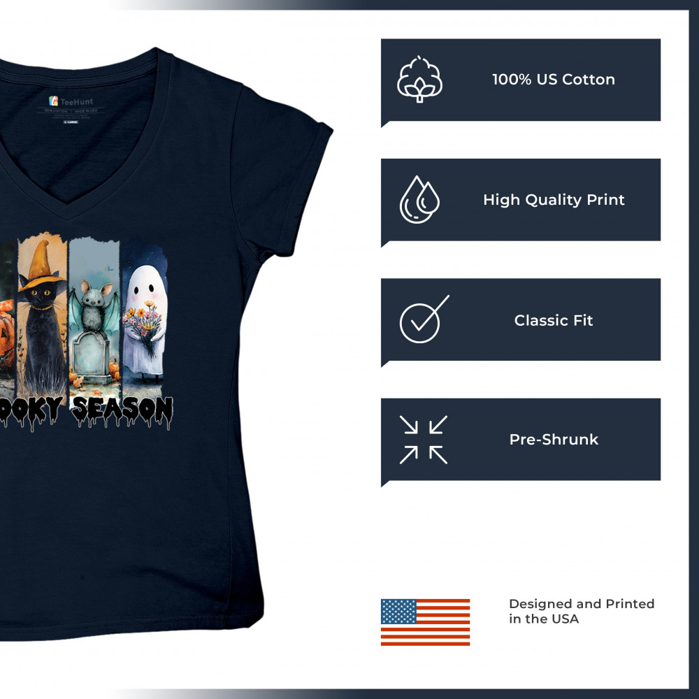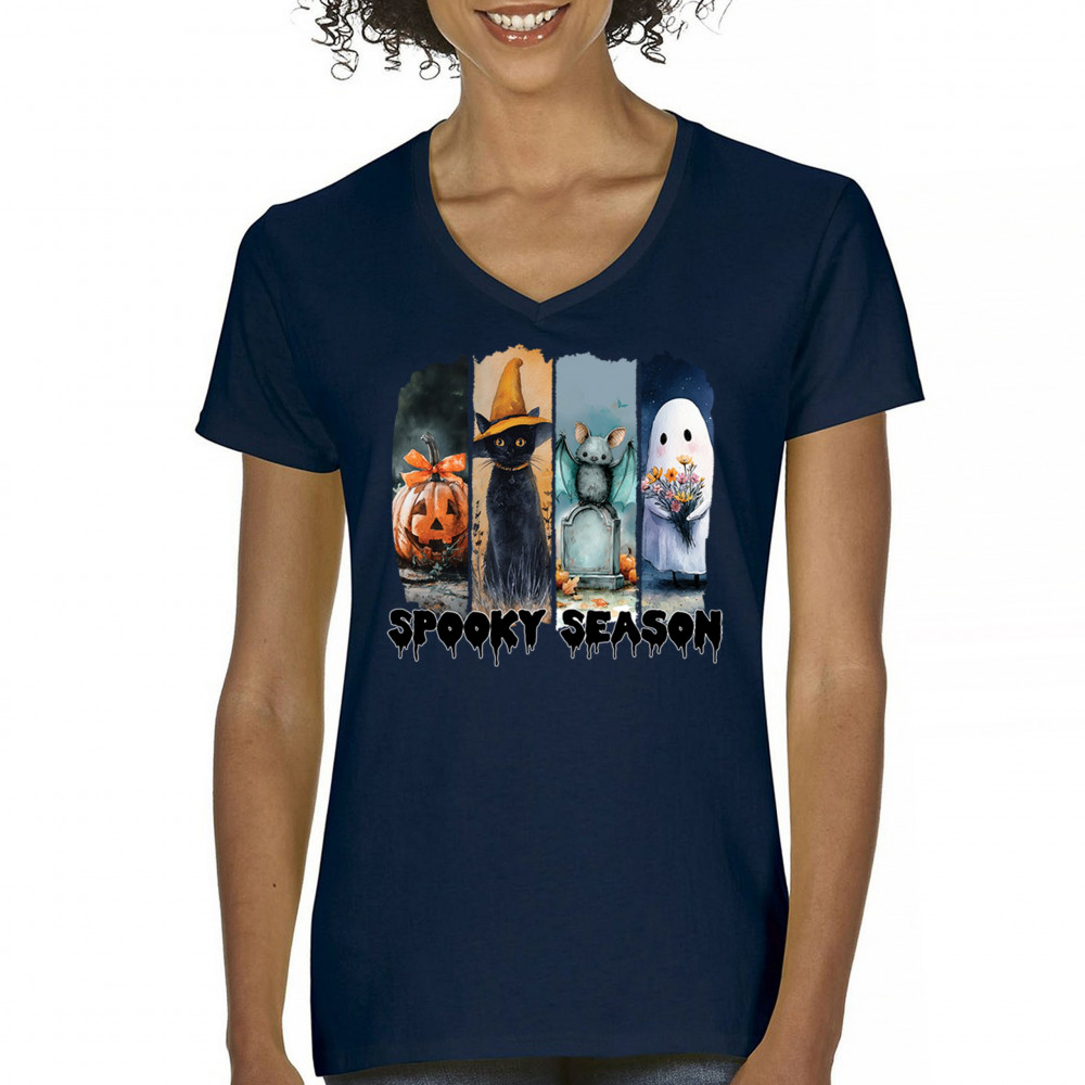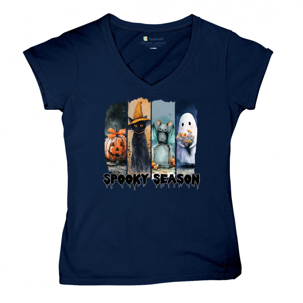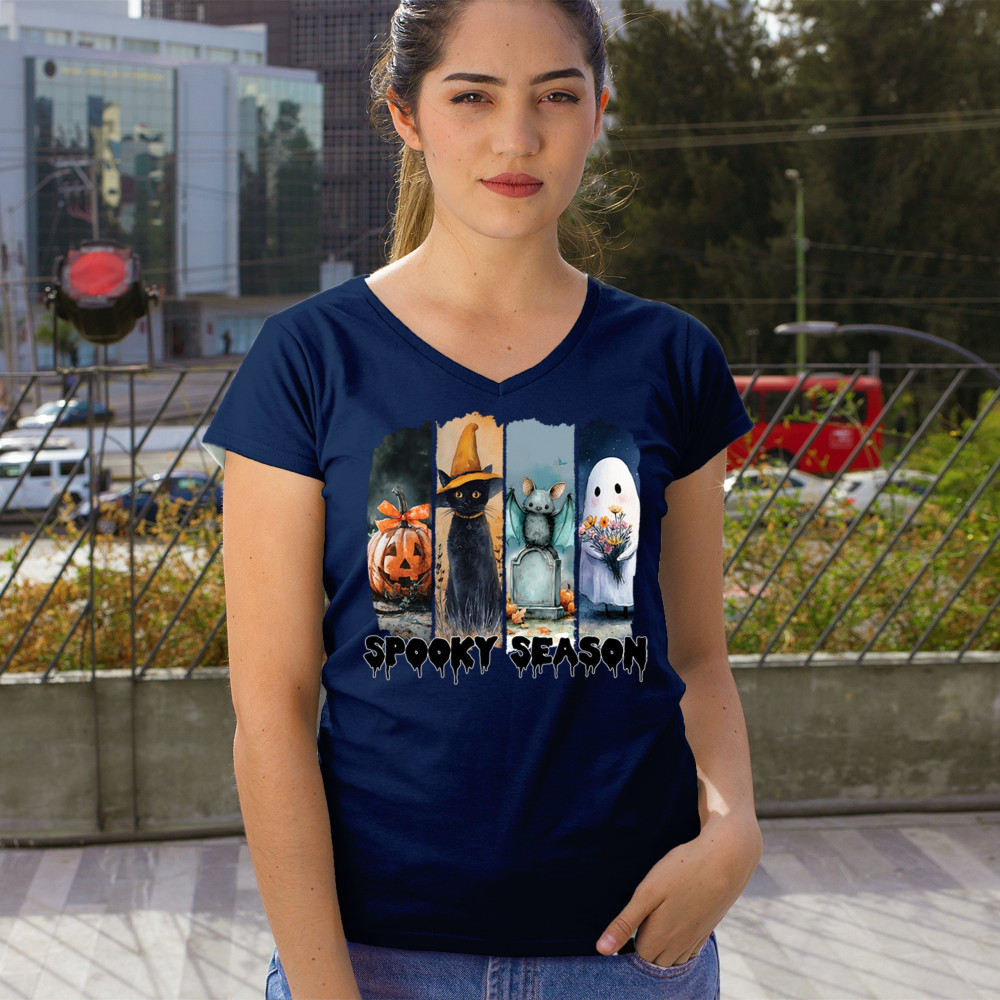 Spooky Season design with scary black cat, jack o lantern, haunted ghost house, and cute ghost. Perfect for October 31, trick or treat, and fall fun.