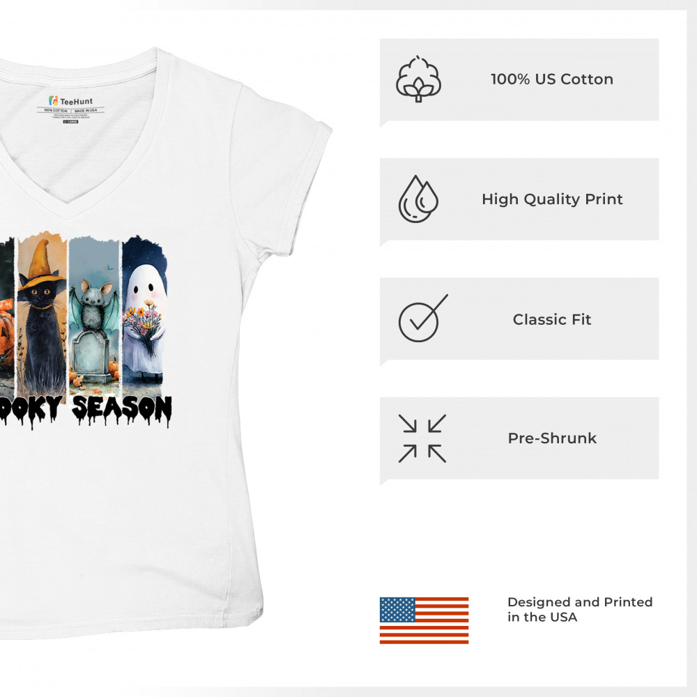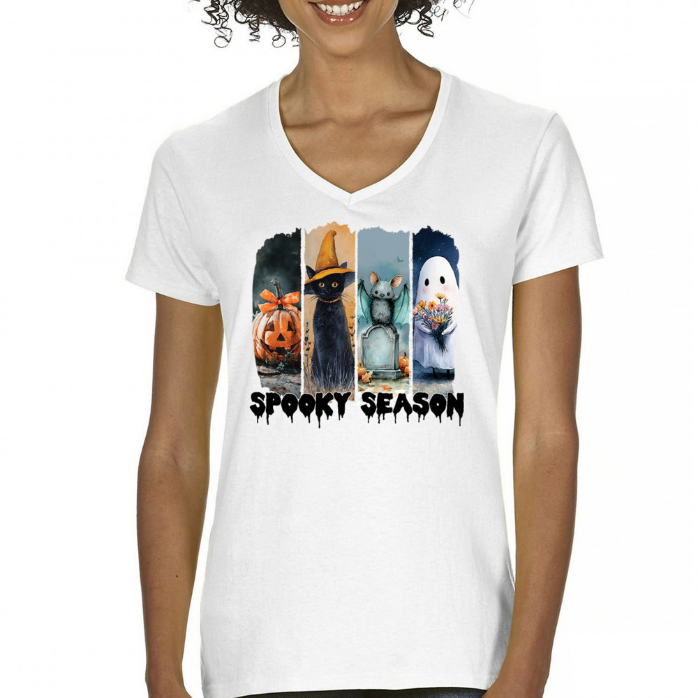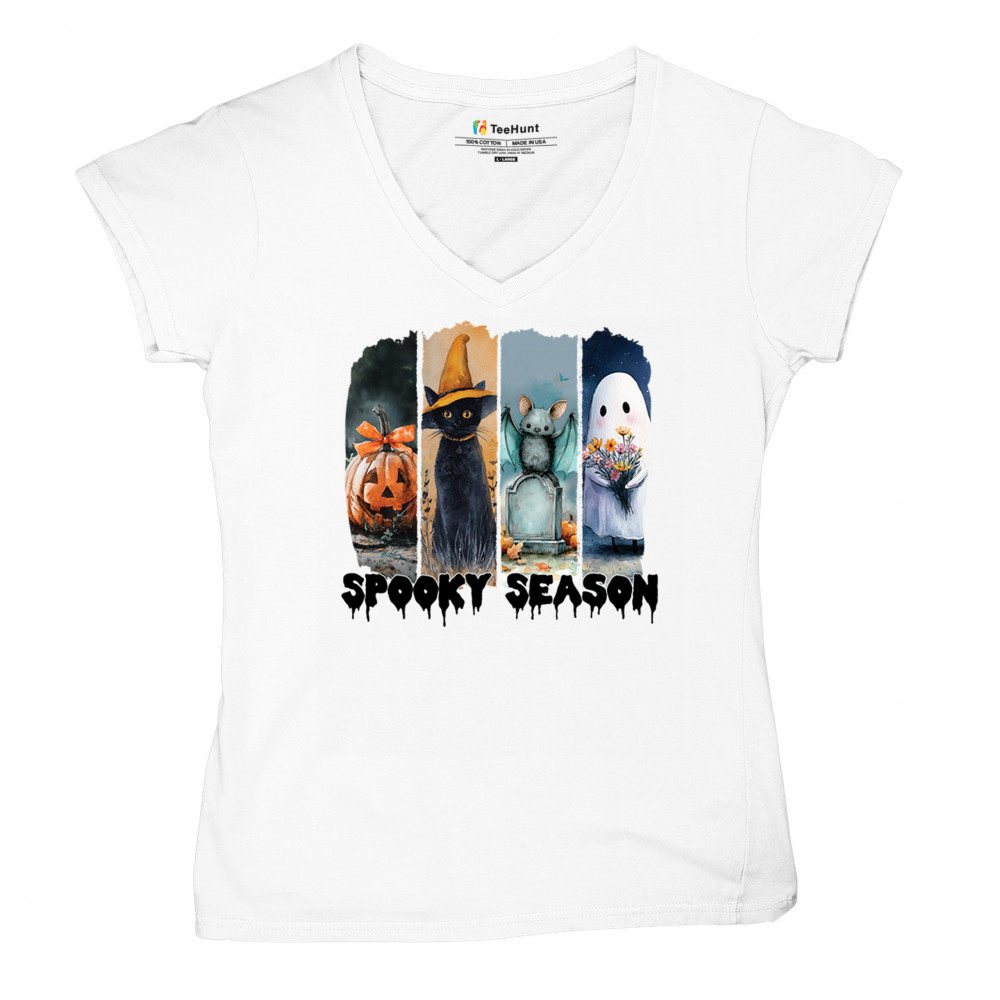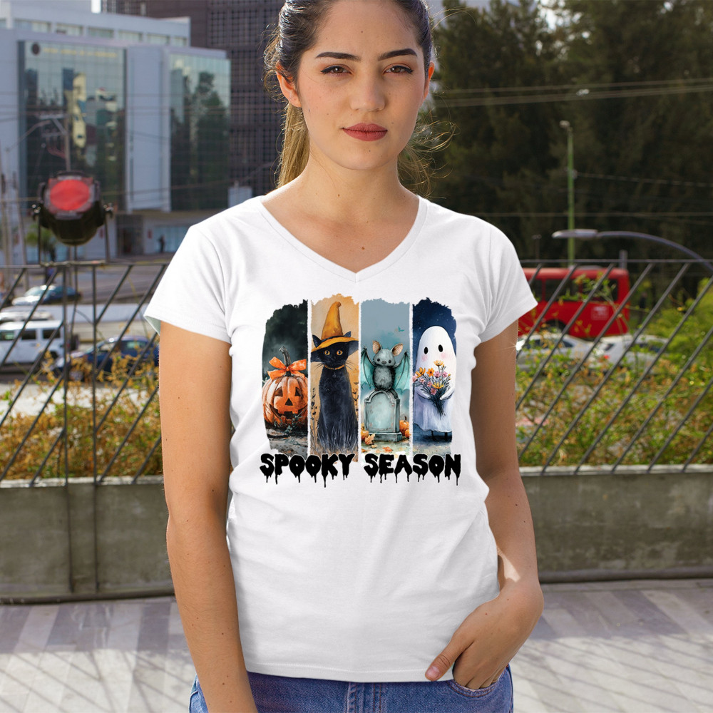 Spooky Season design with scary black cat, jack o lantern, haunted ghost house, and cute ghost. Perfect for October 31, trick or treat, and fall fun.