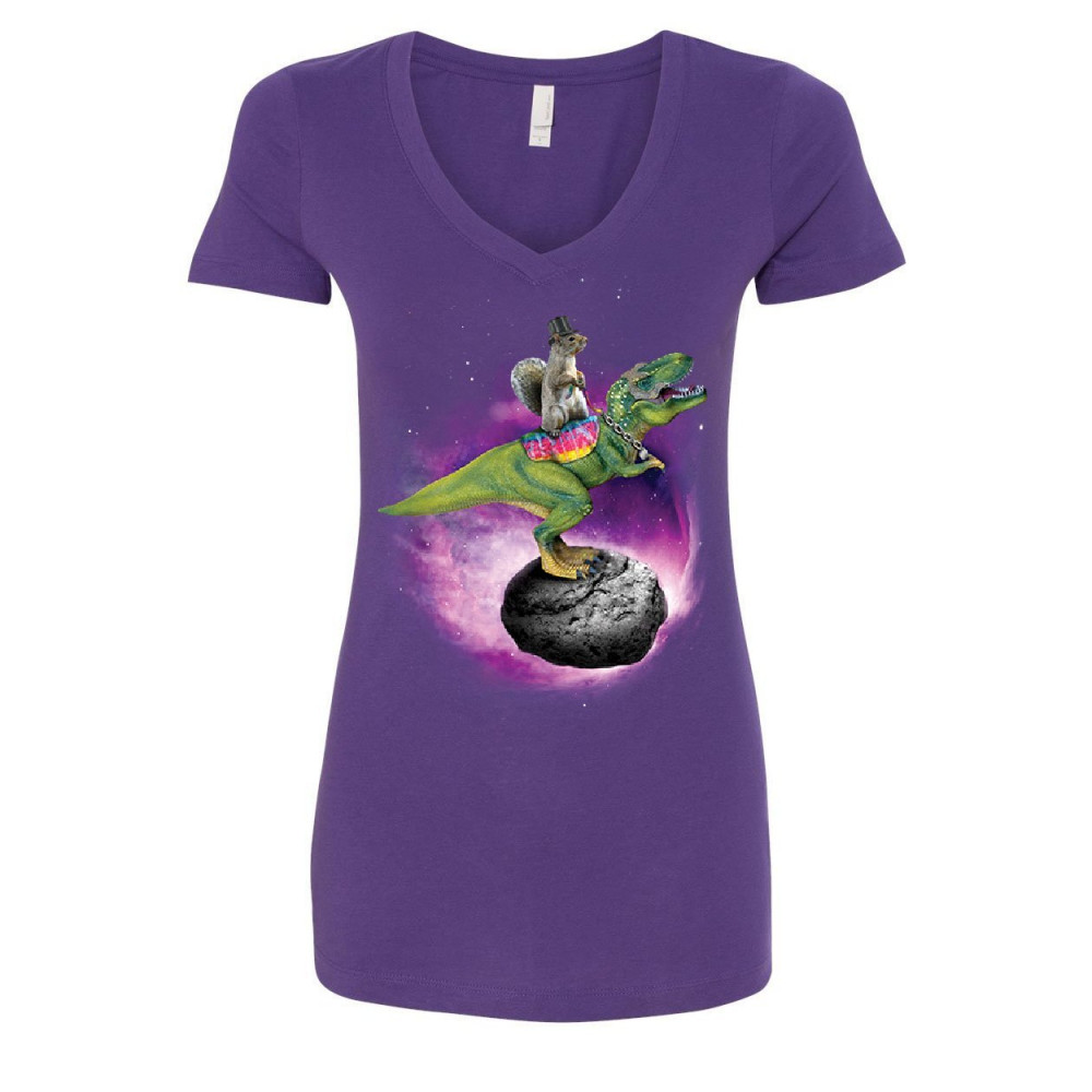SQUIRREL RIDING T-REX RIDING ASTEROID women's v-neck t-shirt funny space weird purple