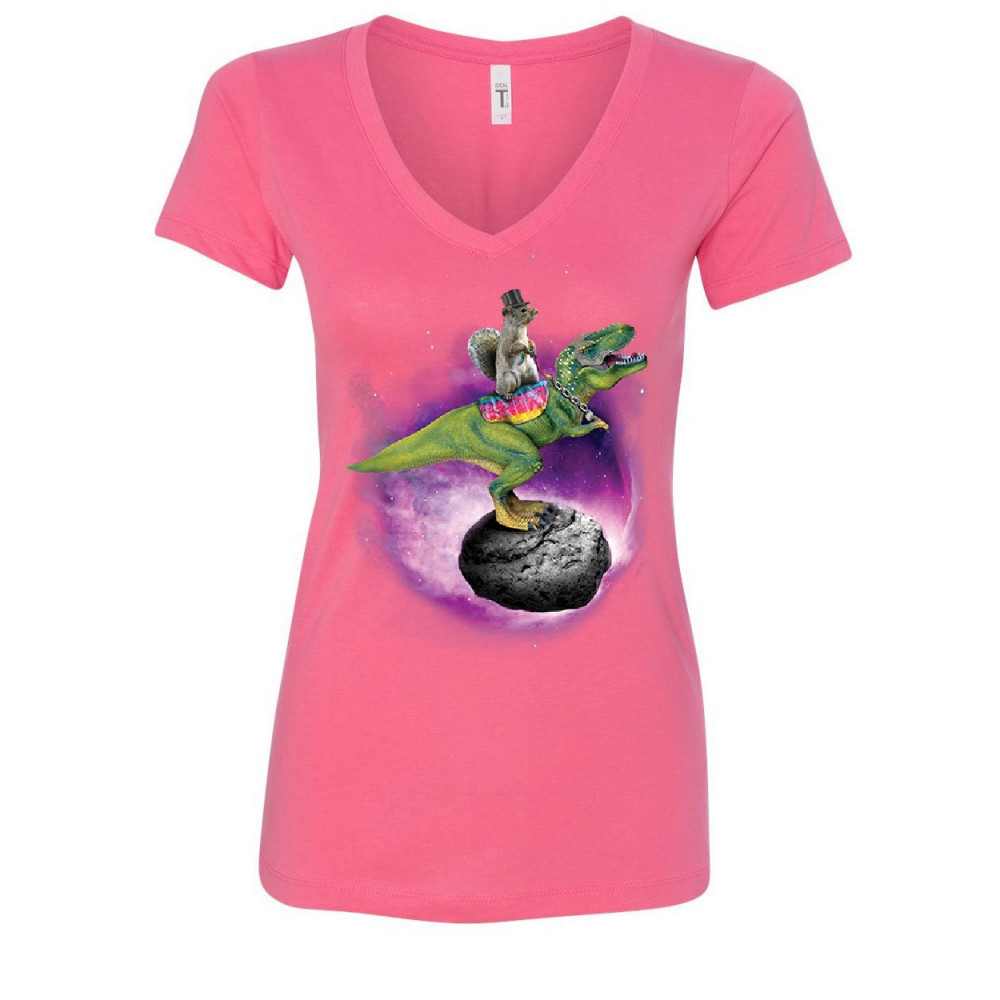 SQUIRREL RIDING T-REX RIDING ASTEROID women's v-neck t-shirt funny space weird pink
