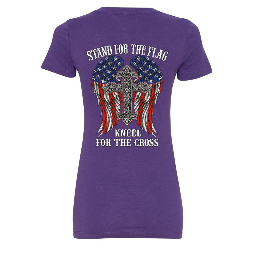 STAND FOR THE FLAG KNEEL FOR THE CROSS women's v-neck t-shirt patriot political purple