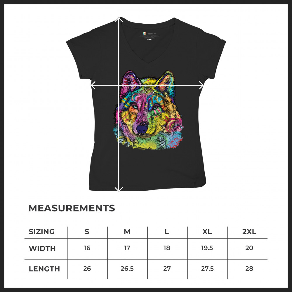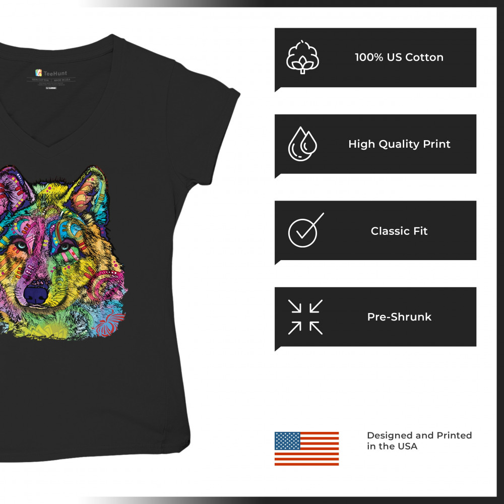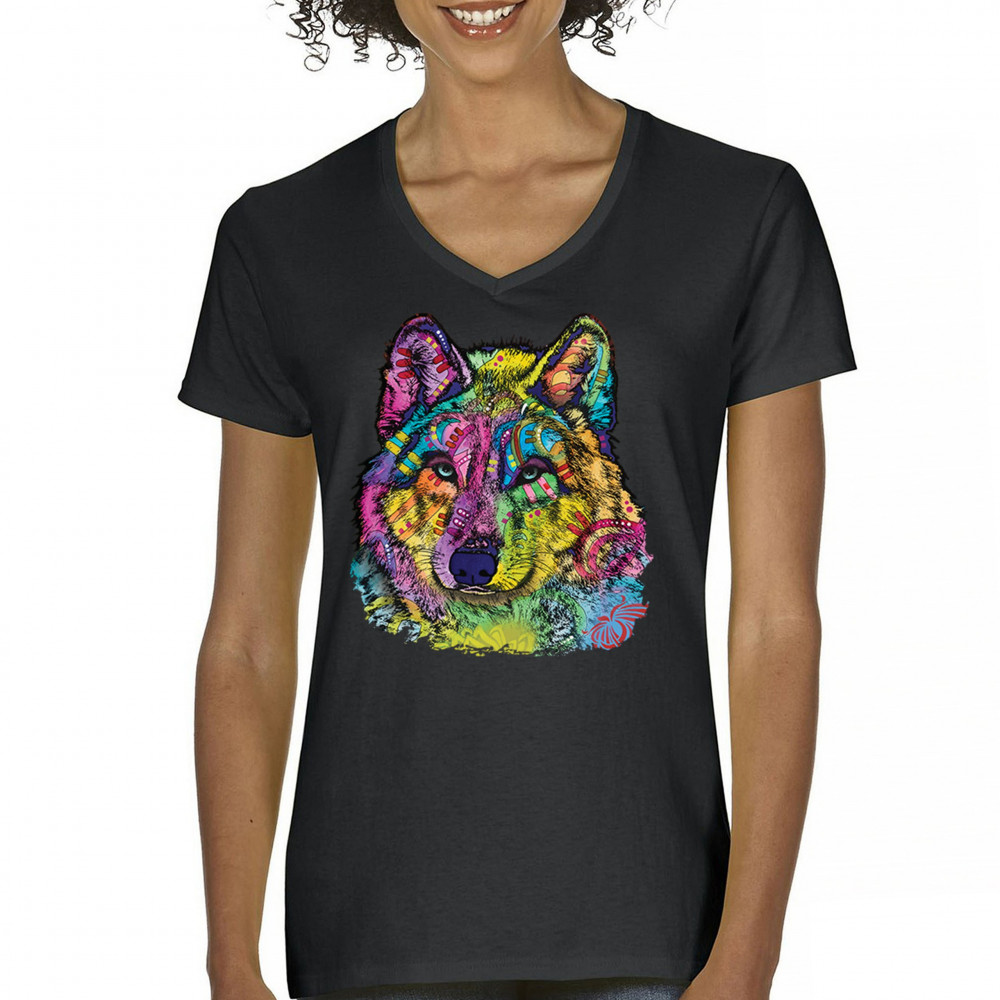 STARE OF THE WOLF women's v-neck t-shirt dean russo colorful neon animal tee black