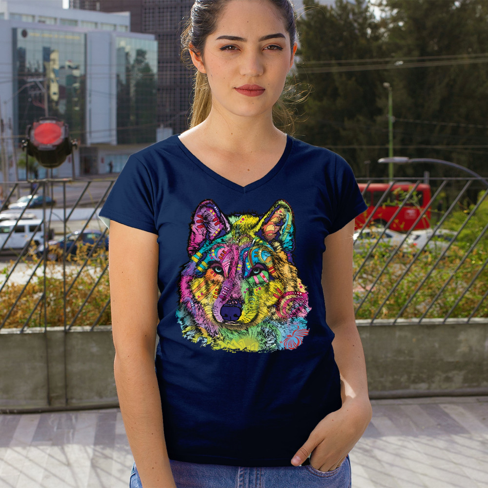 STARE OF THE WOLF women's v-neck t-shirt dean russo colorful neon animal tee navy blue