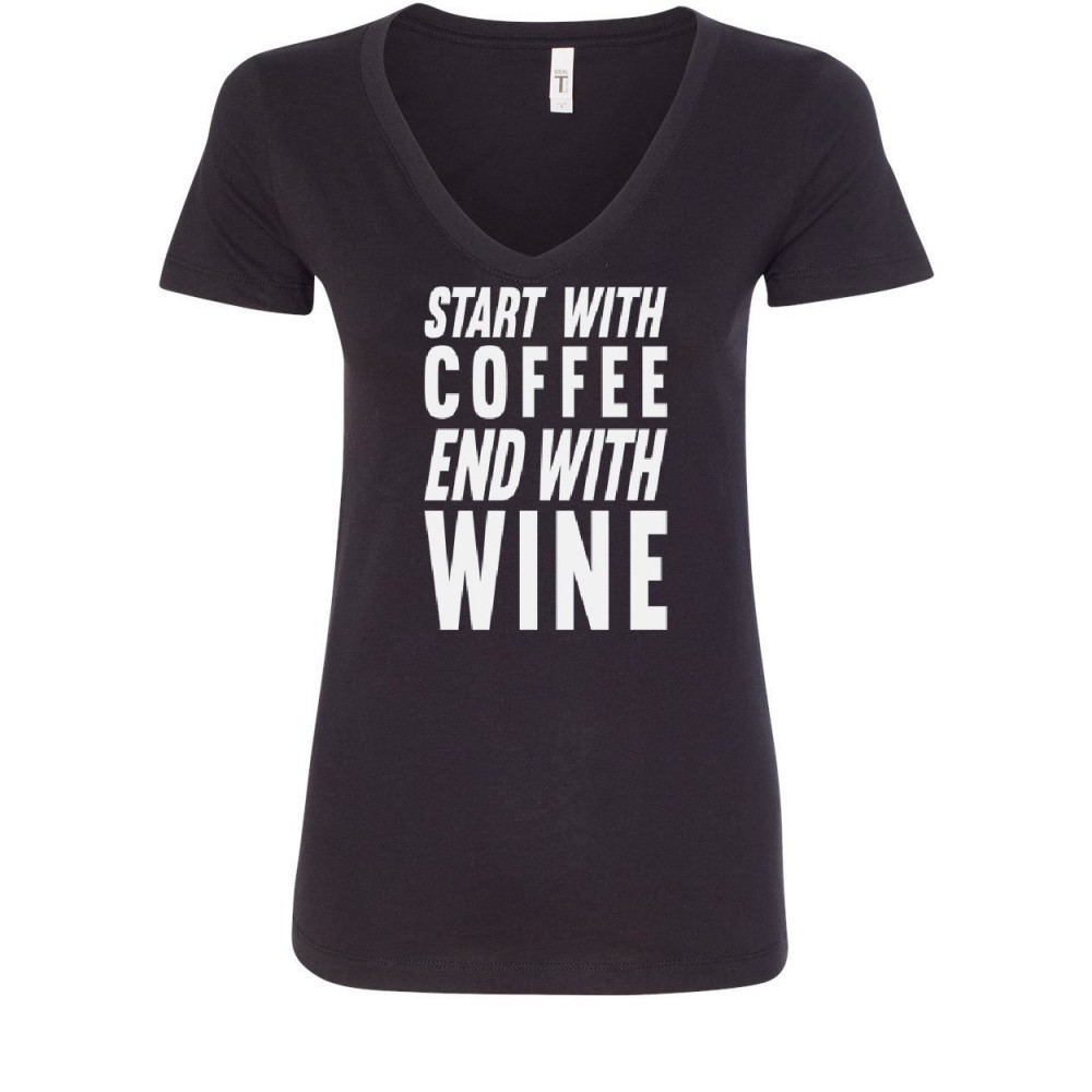 START WITH COFFEE END WITH WINE women's v-neck t-shirt drinking daily routine black