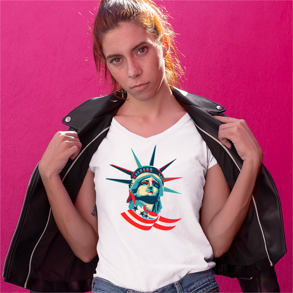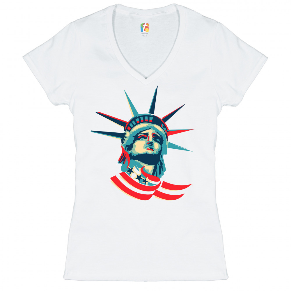 A patriotic print featuring a dripping silhouette of a bald eagle. The body is painted blue with lots of stars on it and the feathers of the wings, painted red, resemble the stripes of the American Flag. Over the wings there is a text written: "Land of the free home of the brave". Great choice to wear on Independence Day or any other patriotic holiday.