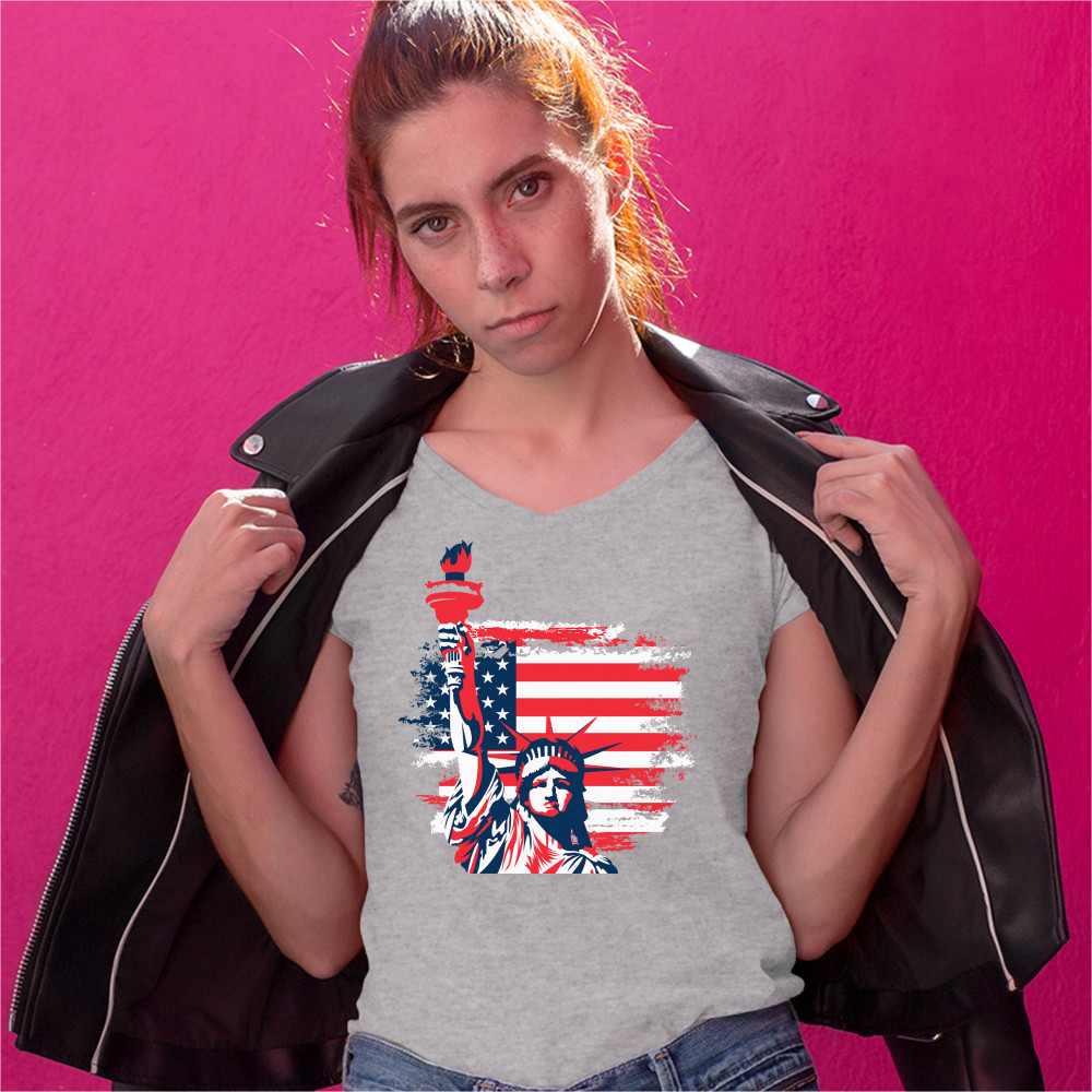 A patriotic print featuring a dripping silhouette of a bald eagle. The body is painted blue with lots of stars on it and the feathers of the wings, painted red, resemble the stripes of the American Flag. Over the wings there is a text written: "Land of the free home of the brave". Great choice to wear on Independence Day or any other patriotic holiday.