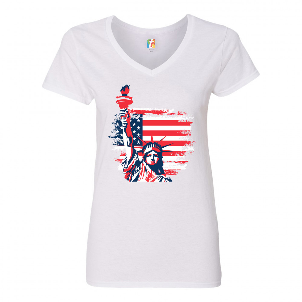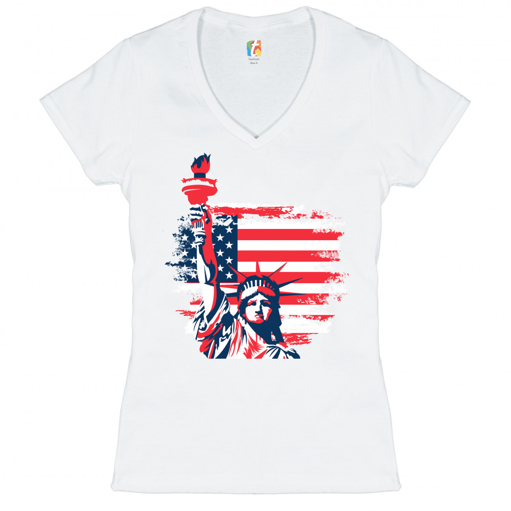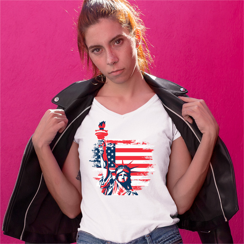 A patriotic print featuring a dripping silhouette of a bald eagle. The body is painted blue with lots of stars on it and the feathers of the wings, painted red, resemble the stripes of the American Flag. Over the wings there is a text written: "Land of the free home of the brave". Great choice to wear on Independence Day or any other patriotic holiday.