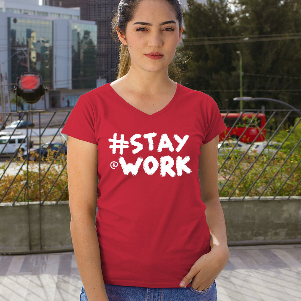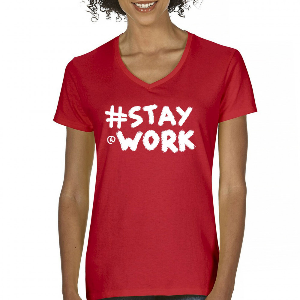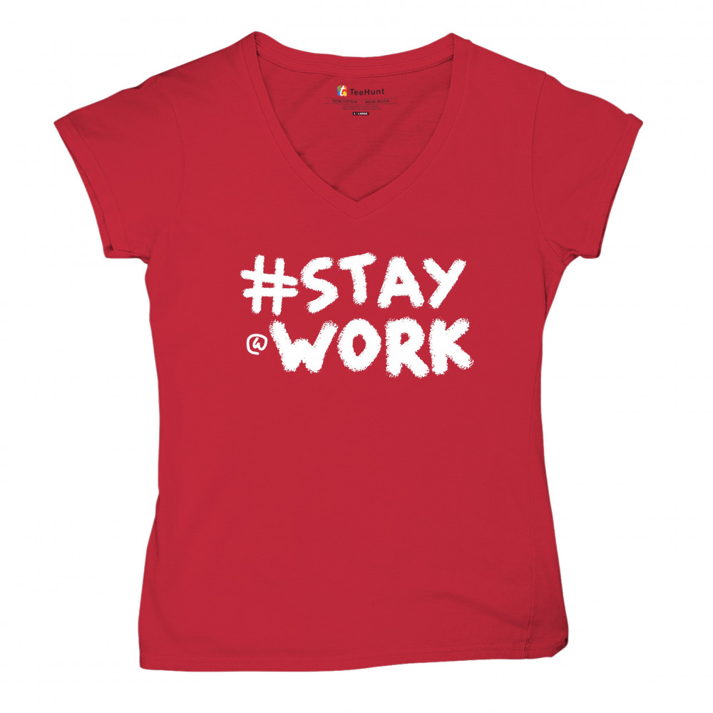 STAY AT WORK FUNNY ELON MUSK TWEET PARODY women's v-neck t-shirt sarcasm tee red