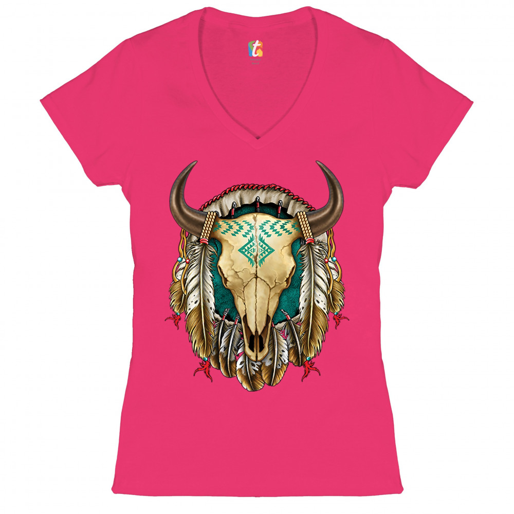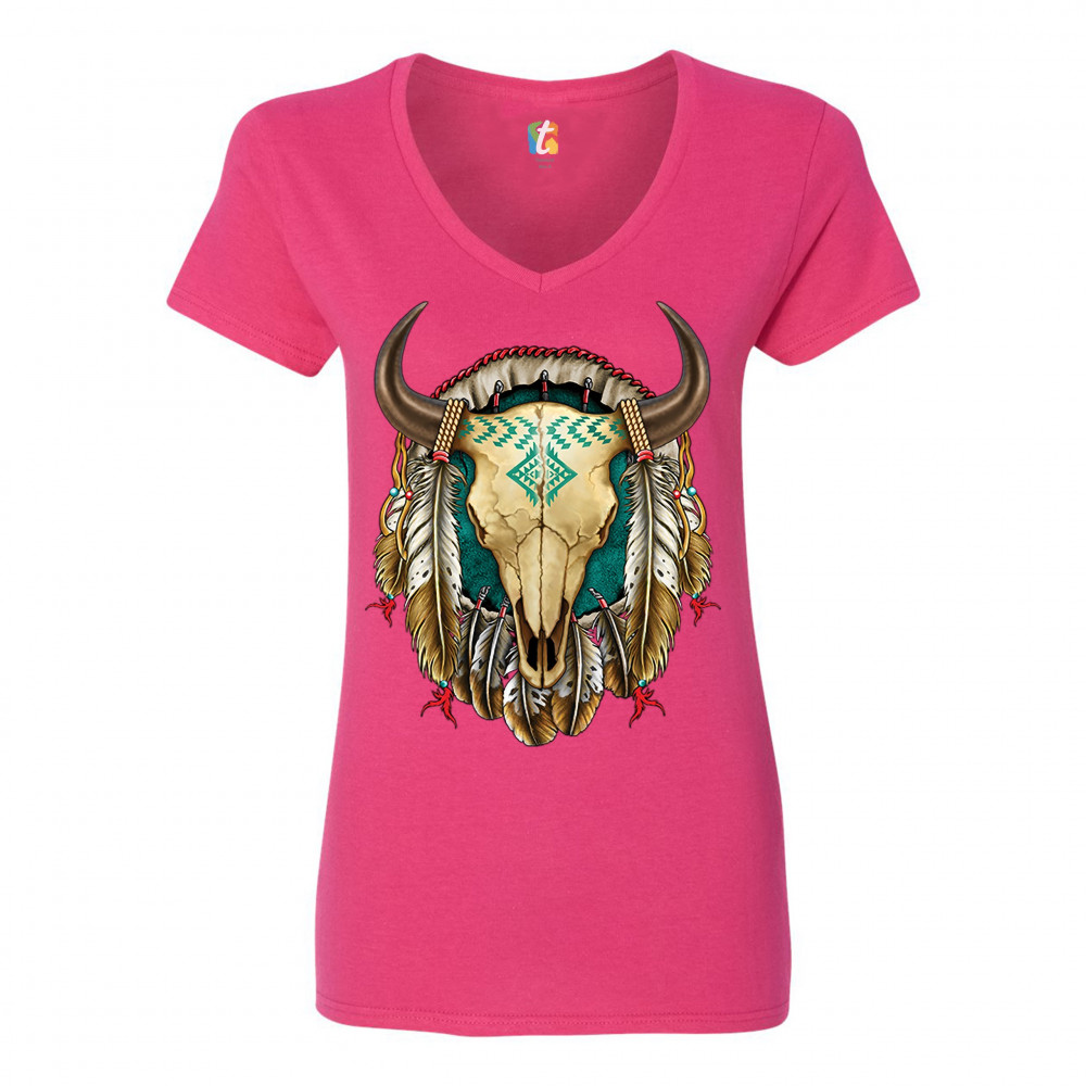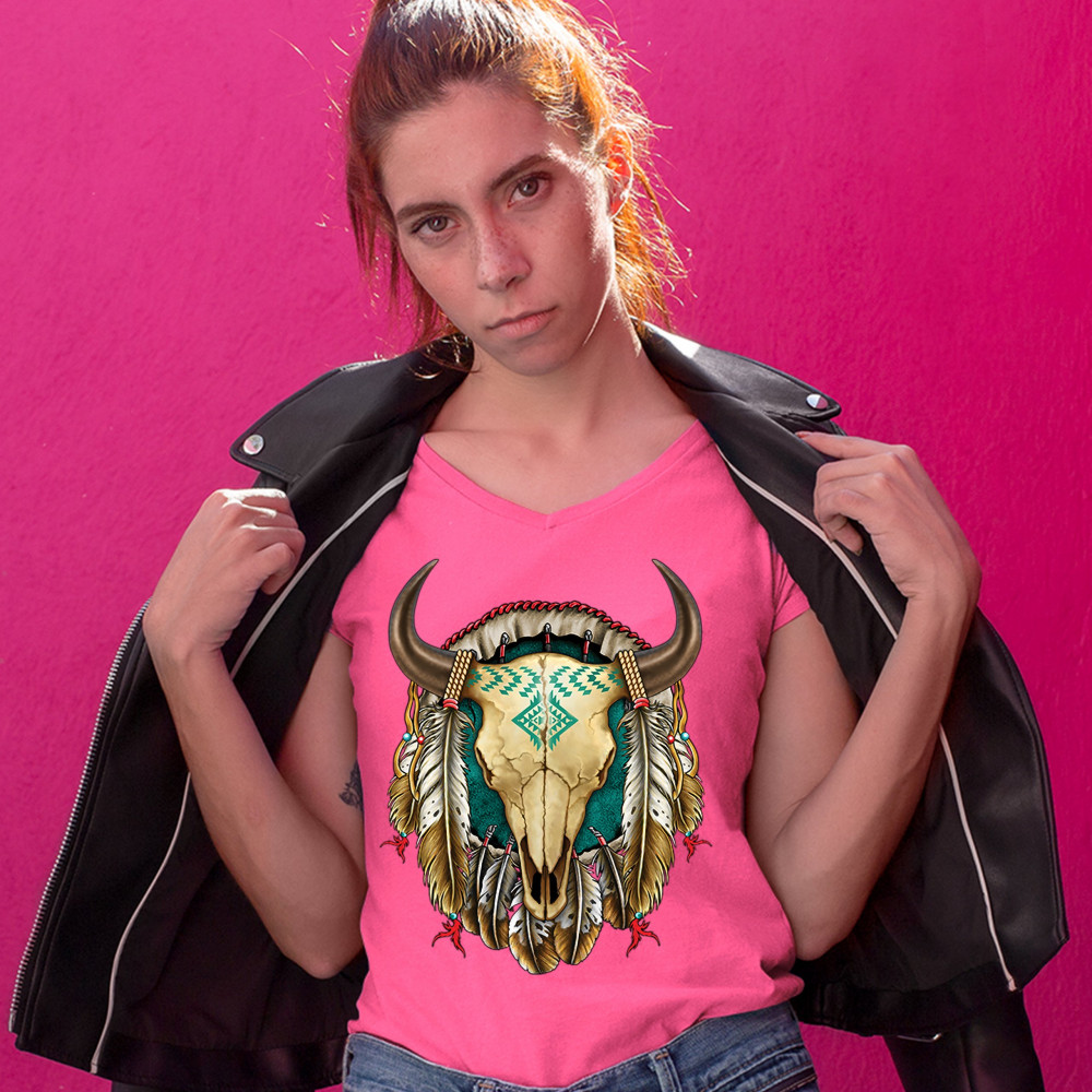 STEER SKULL DREAMCATCHER women's v-neck t-shirt native american indigenous tee pink