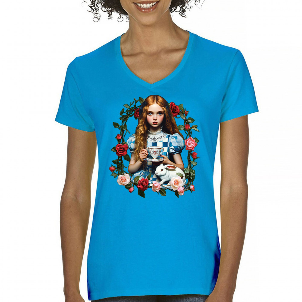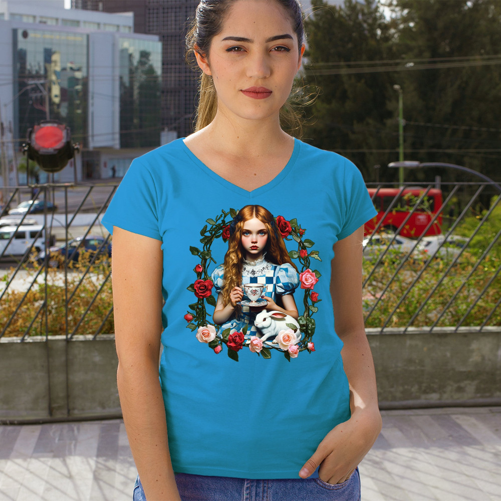 Step into a storybook dream with this Wonderland-inspired design featuring a young girl at a tea party with her white rabbit companion. Framed by roses, it evokes vintage charm, fantasy, and magical nostalgia. Ideal for bookworms, collectors, and lovers of fairytales, it blends whimsical elegance with timeless childhood wonder.