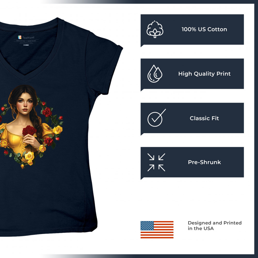 Romantic fantasy design of girl in yellow gown with red rose. Inspired by Beauty and the Beast, full of fairytale magic and classic charm.