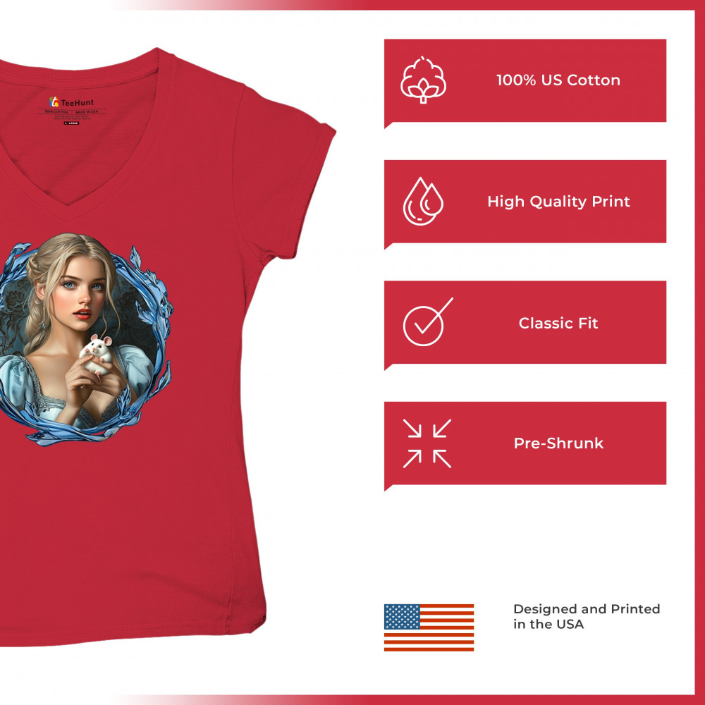 Fairytale design of blonde girl with white mouse in blue leaf frame. Inspired by Cinderella themes of kindness, fantasy, and transformation.