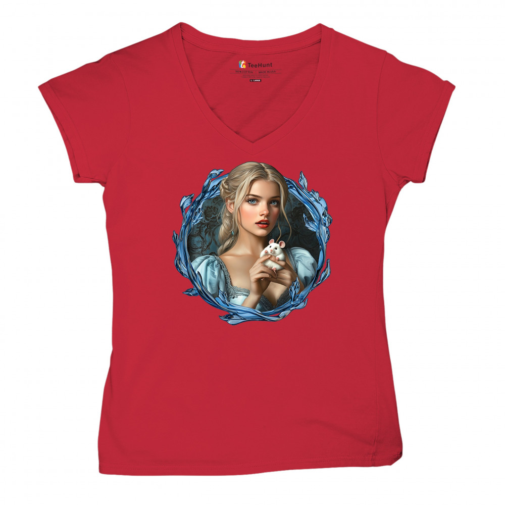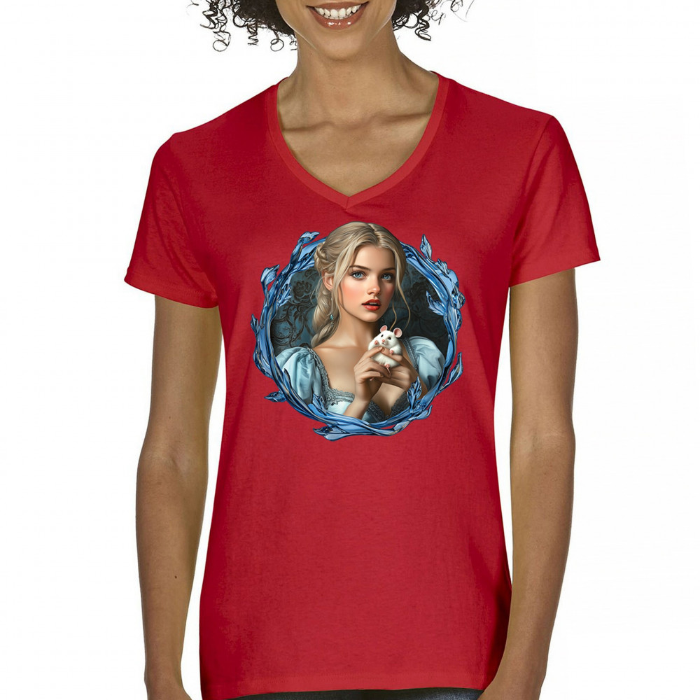 A whimsical design inspired by fairytales and Cinderella magic, featuring a blonde girl in a blue dress holding a white mouse. The icy blue leaf frame evokes enchantment and transformation. With soft, vintage tones and a dreamy feel, it’s a charming tribute to kindness, fantasy, animal companionship, and gentle storytelling magic.