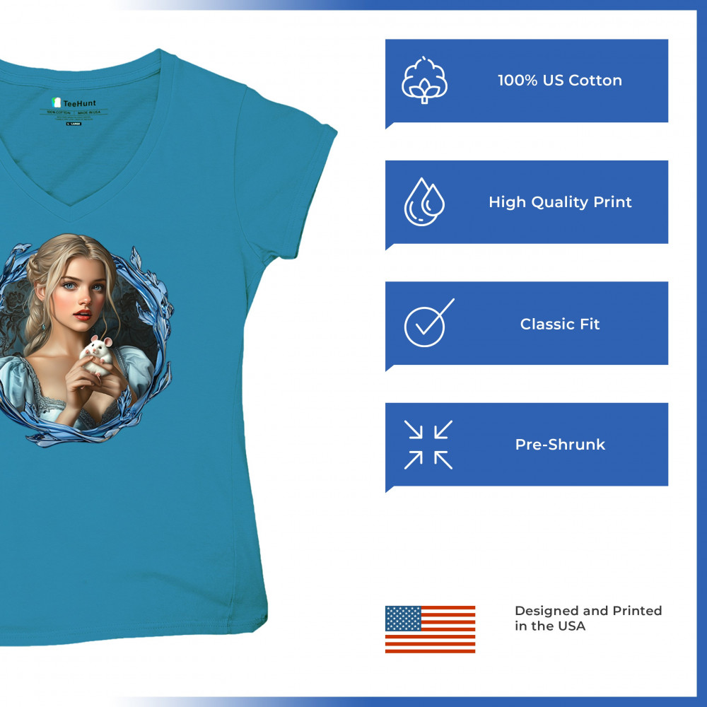 Fairytale design of blonde girl with white mouse in blue leaf frame. Inspired by Cinderella themes of kindness, fantasy, and transformation.