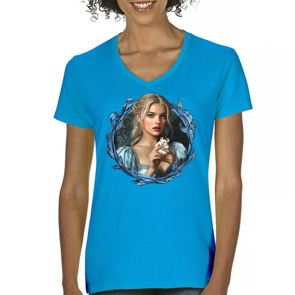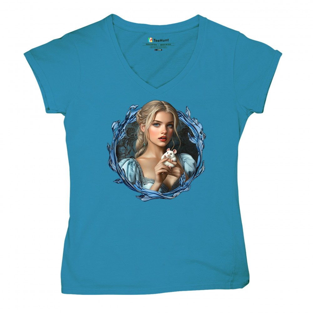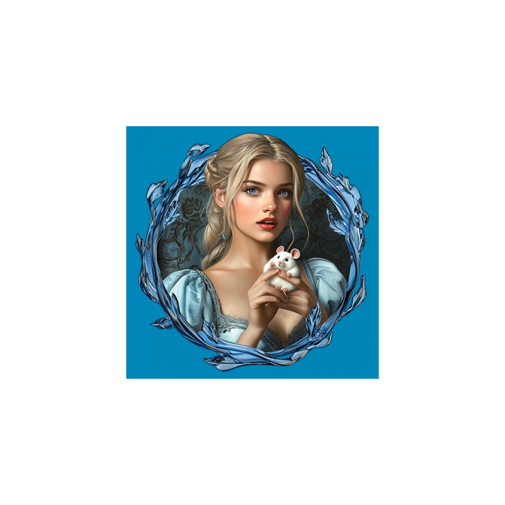 A whimsical design inspired by fairytales and Cinderella magic, featuring a blonde girl in a blue dress holding a white mouse. The icy blue leaf frame evokes enchantment and transformation. With soft, vintage tones and a dreamy feel, it’s a charming tribute to kindness, fantasy, animal companionship, and gentle storytelling magic.