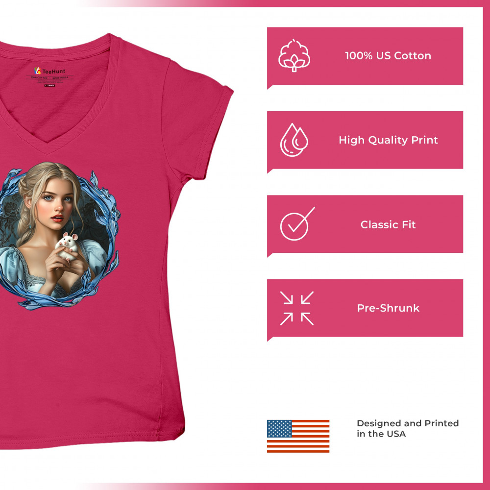 Fairytale design of blonde girl with white mouse in blue leaf frame. Inspired by Cinderella themes of kindness, fantasy, and transformation.