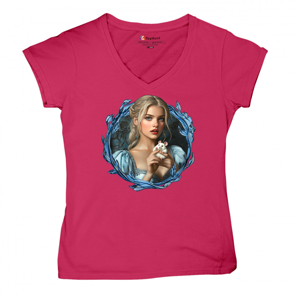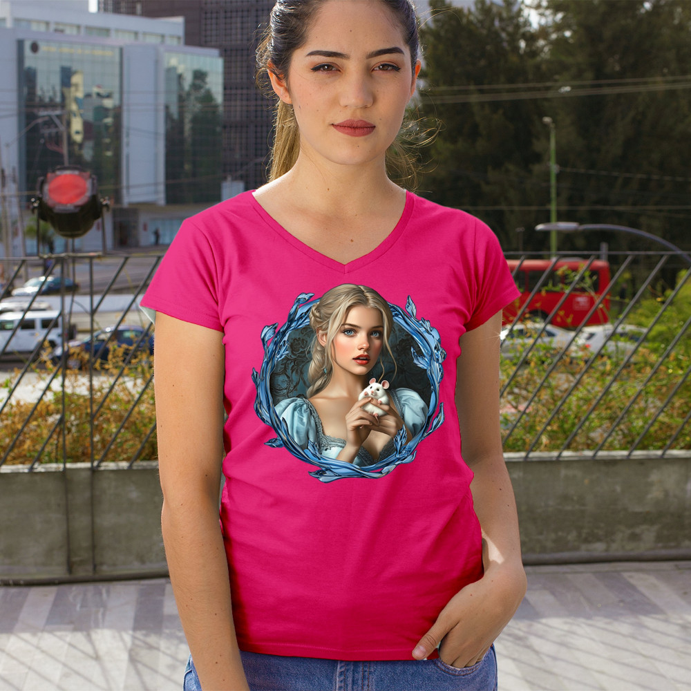 A whimsical design inspired by fairytales and Cinderella magic, featuring a blonde girl in a blue dress holding a white mouse. The icy blue leaf frame evokes enchantment and transformation. With soft, vintage tones and a dreamy feel, it’s a charming tribute to kindness, fantasy, animal companionship, and gentle storytelling magic.