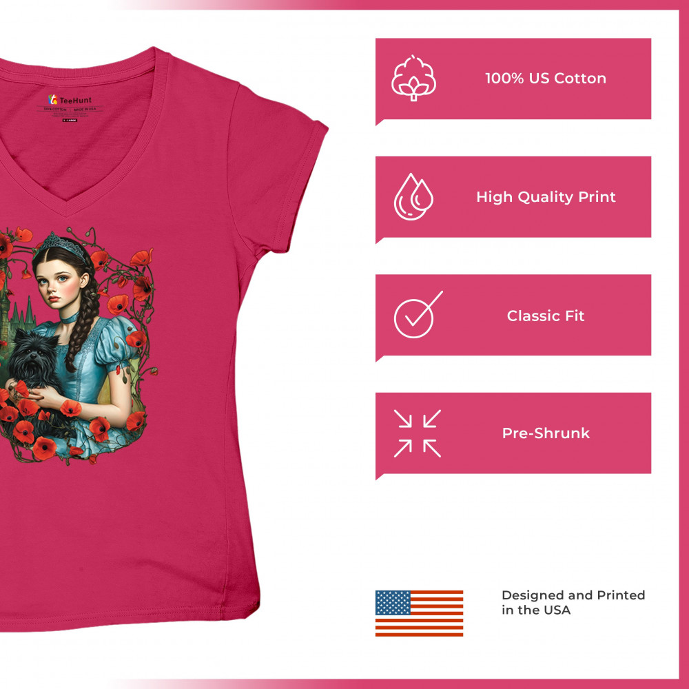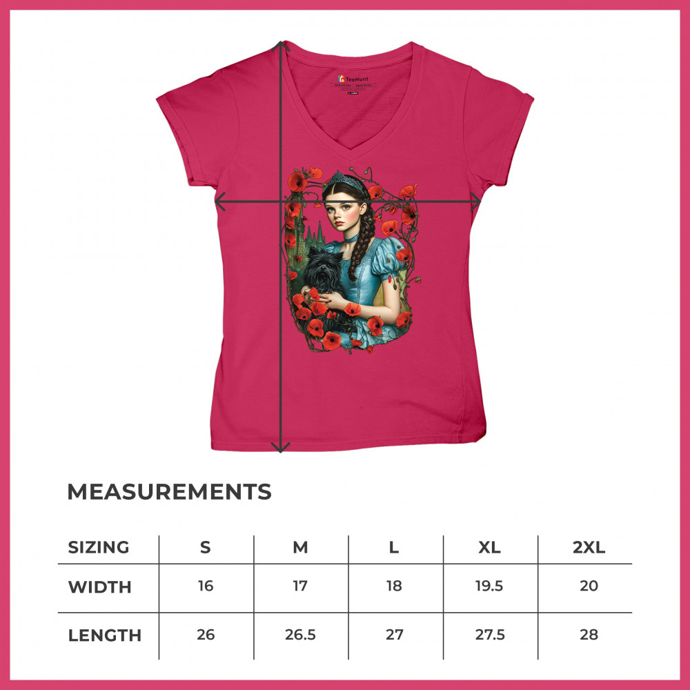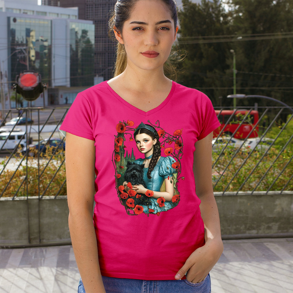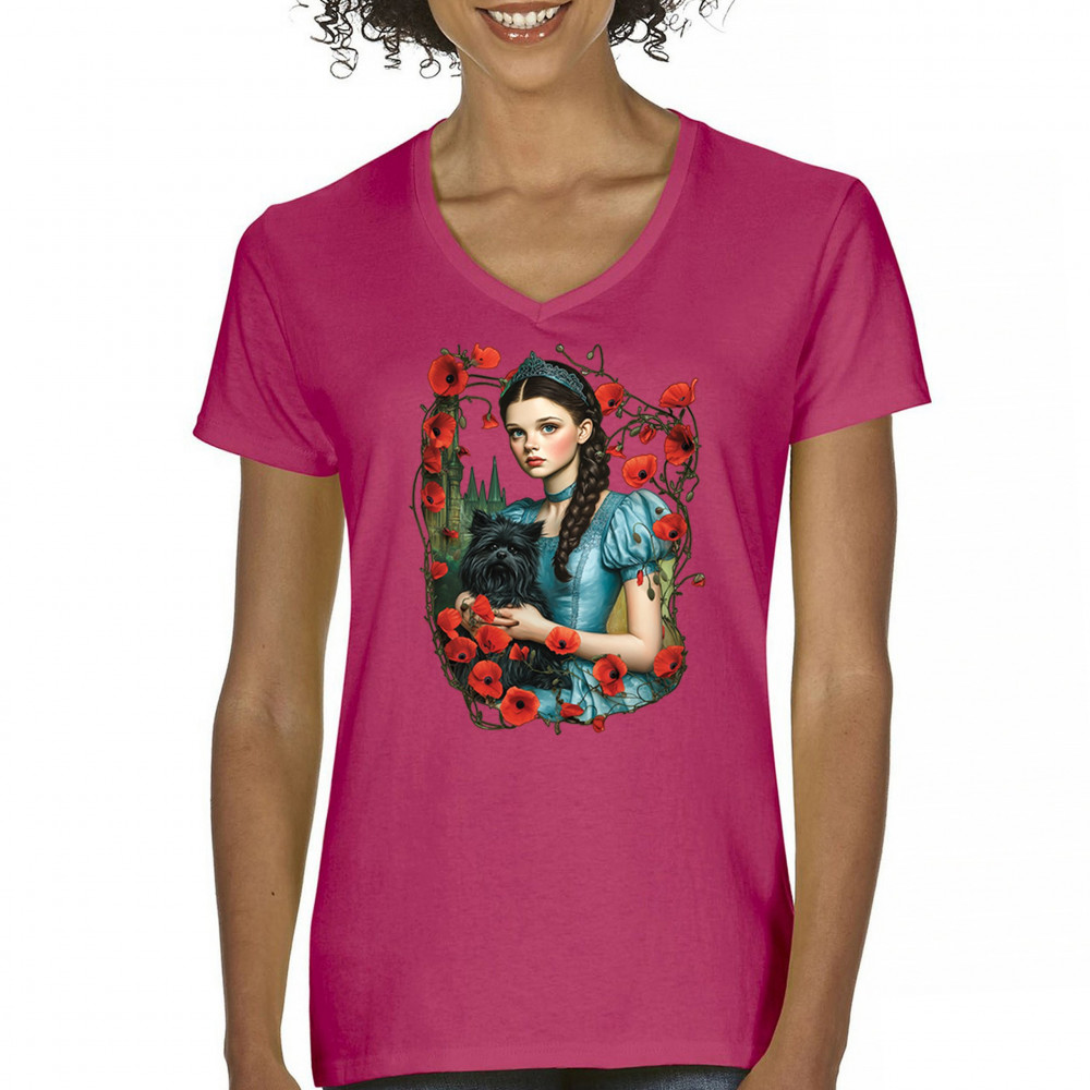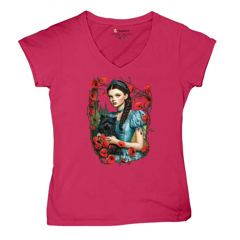 A charming design inspired by dark fairytales, featuring a girl in a blue dress holding her black dog amidst blooming red poppies. A distant castle and vintage styling channel Wizard of Oz fantasy with a gothic twist. Ideal for dreamers, nostalgic collectors, and lovers of whimsical storybook art filled with magic and memory.