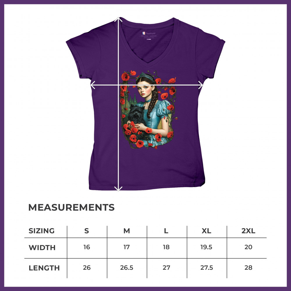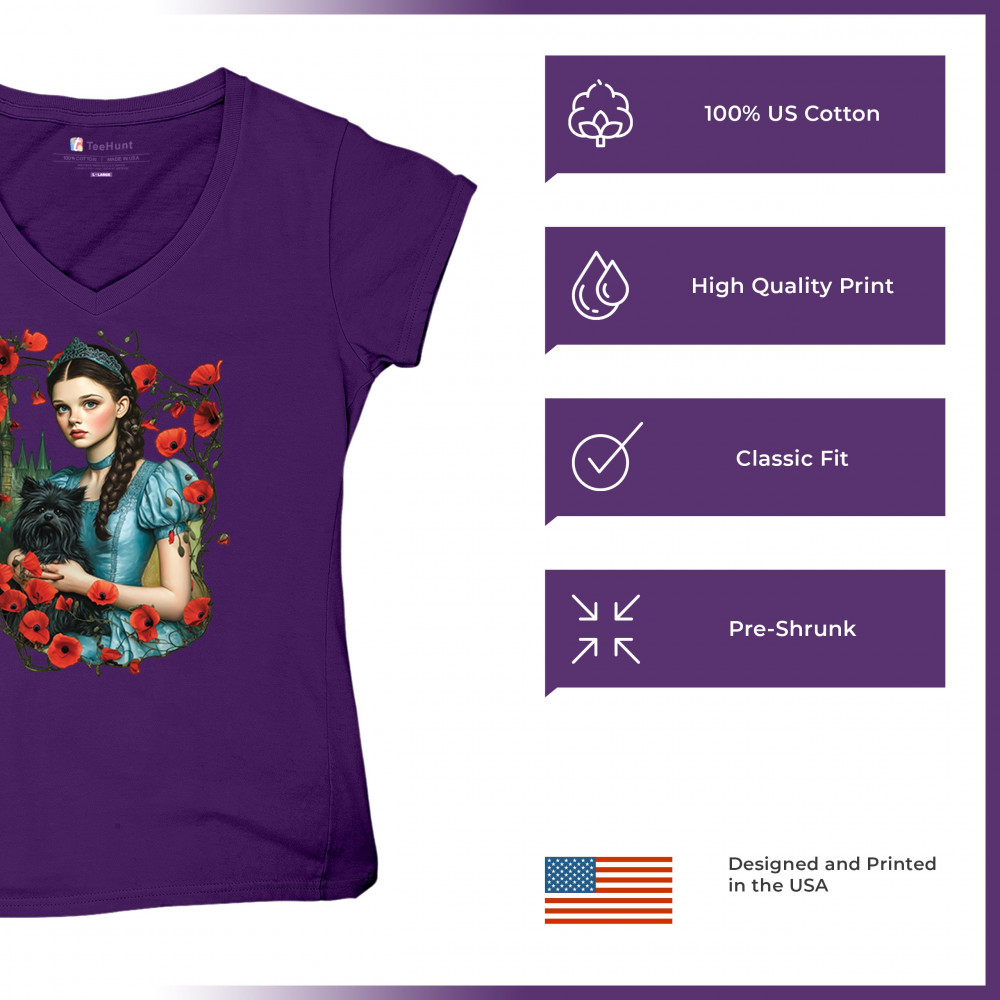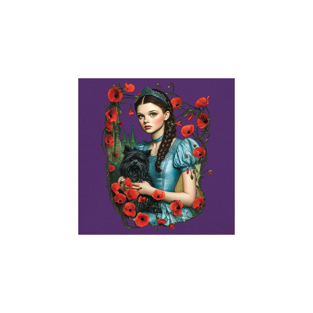 A charming design inspired by dark fairytales, featuring a girl in a blue dress holding her black dog amidst blooming red poppies. A distant castle and vintage styling channel Wizard of Oz fantasy with a gothic twist. Ideal for dreamers, nostalgic collectors, and lovers of whimsical storybook art filled with magic and memory.