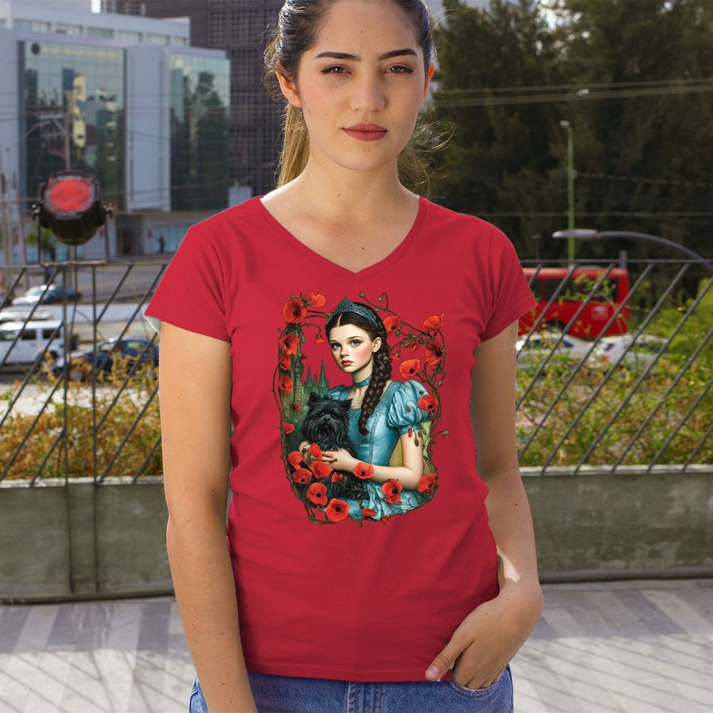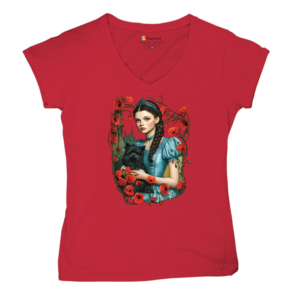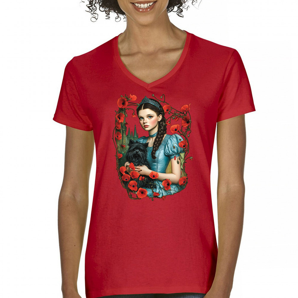 A charming design inspired by dark fairytales, featuring a girl in a blue dress holding her black dog amidst blooming red poppies. A distant castle and vintage styling channel Wizard of Oz fantasy with a gothic twist. Ideal for dreamers, nostalgic collectors, and lovers of whimsical storybook art filled with magic and memory.