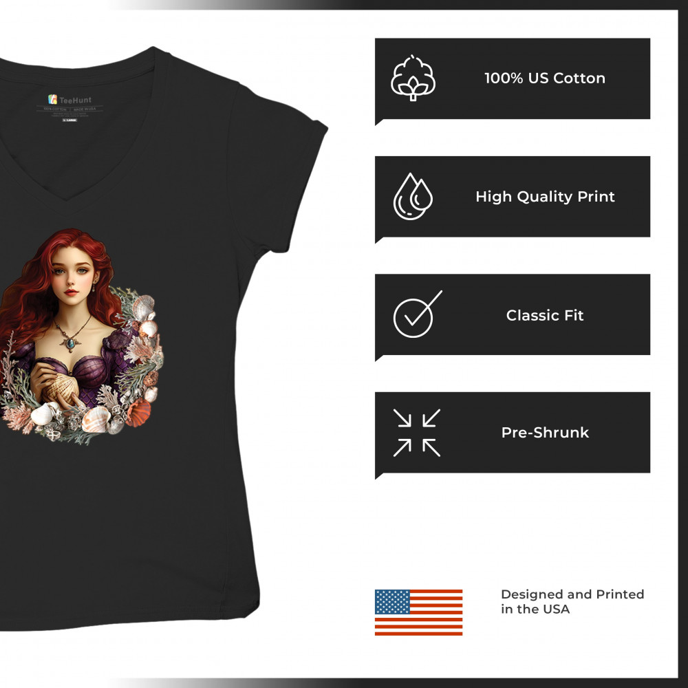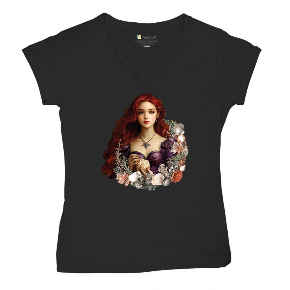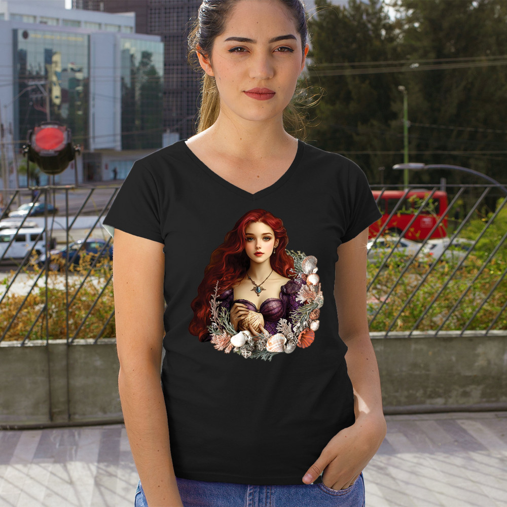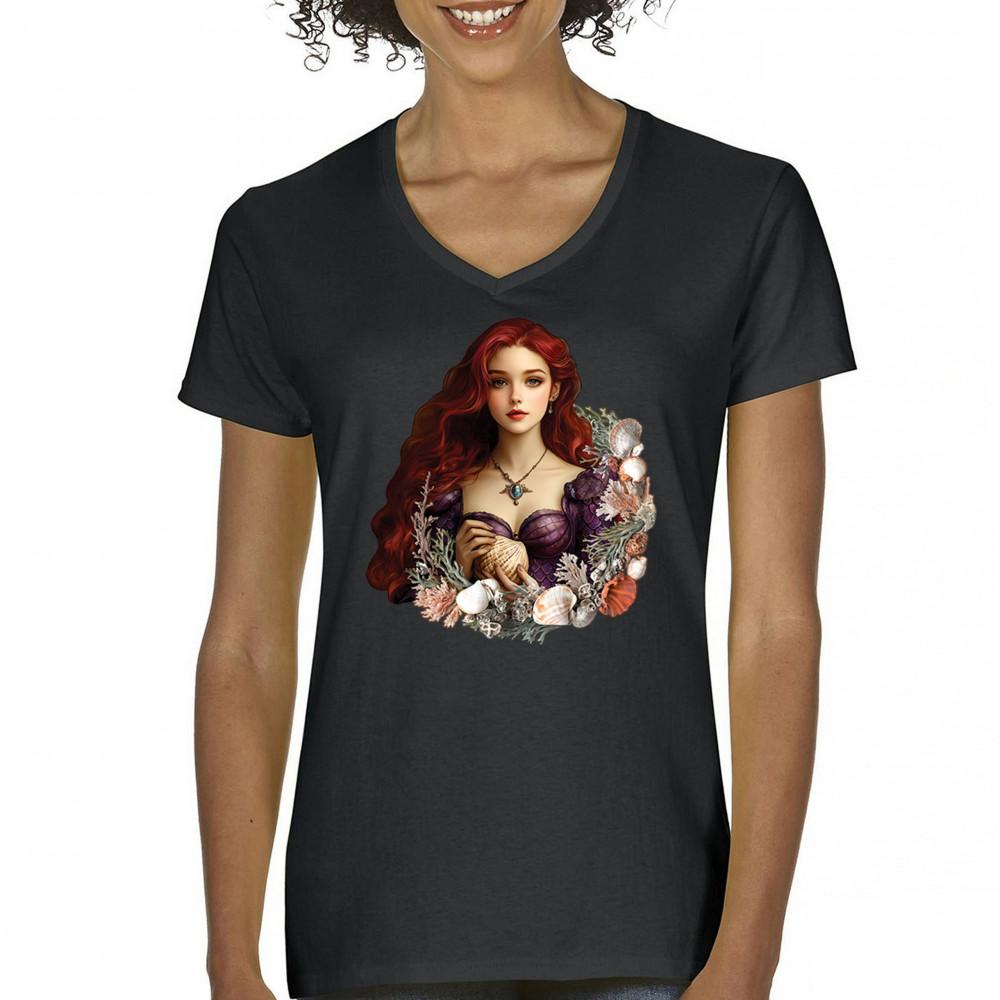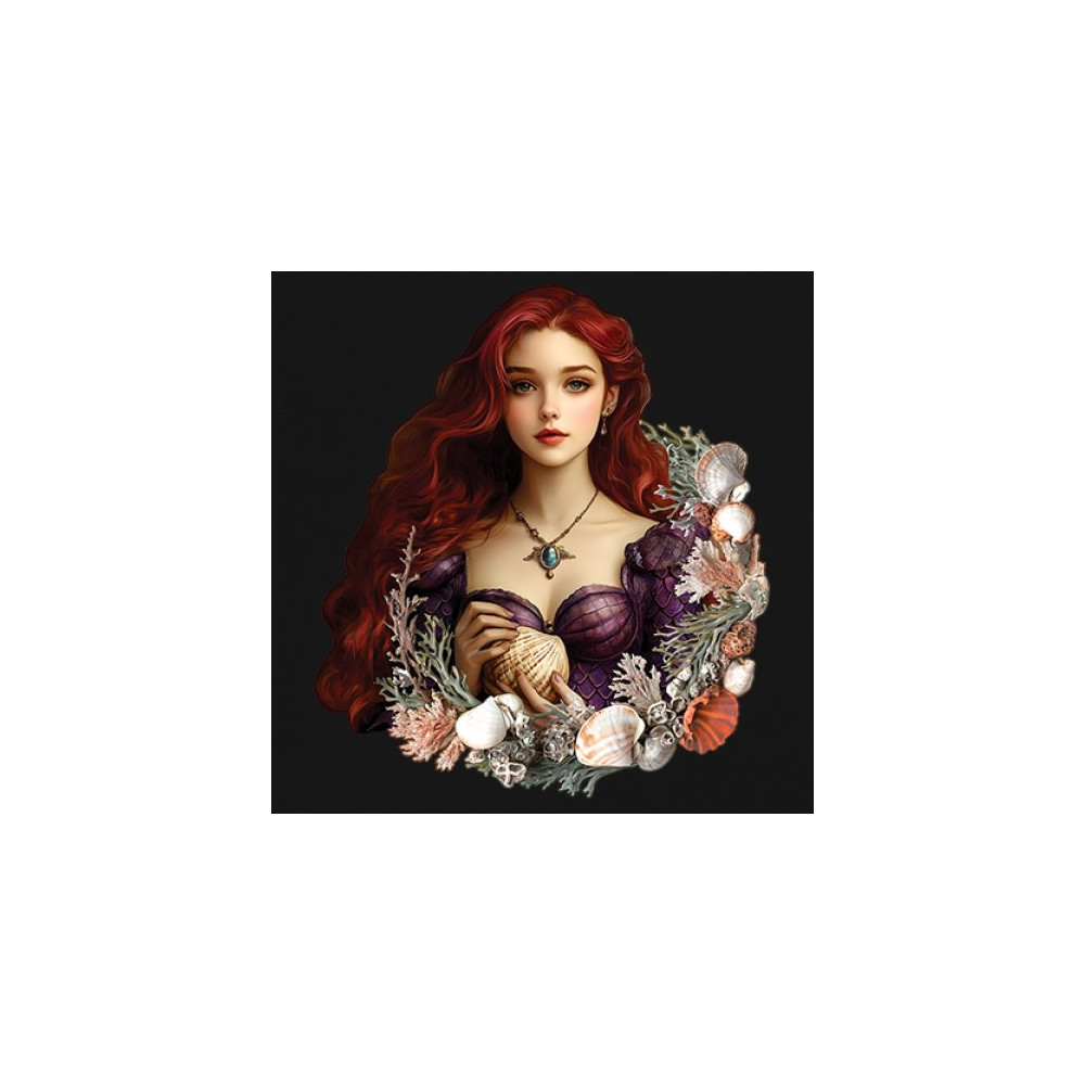 Inspired by mystical ocean themes, this design features a fantasy red-haired girl in a seashell dress, cradling a large shell. She is framed by coral, seaweed, and a shimmering array of ocean shells. With nods to classic mermaid lore and fairytale storytelling, it's perfect for fans of fantasy creatures, marine magic, and romantic ocean legends.