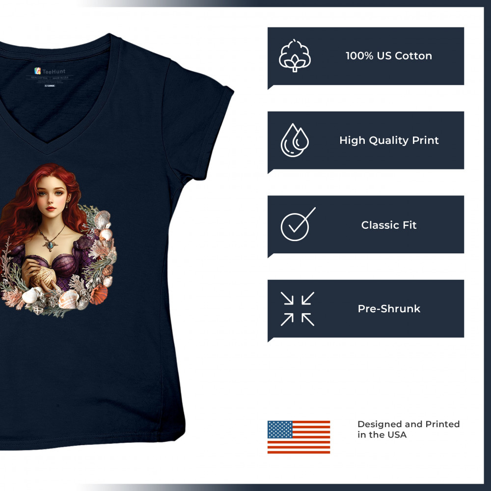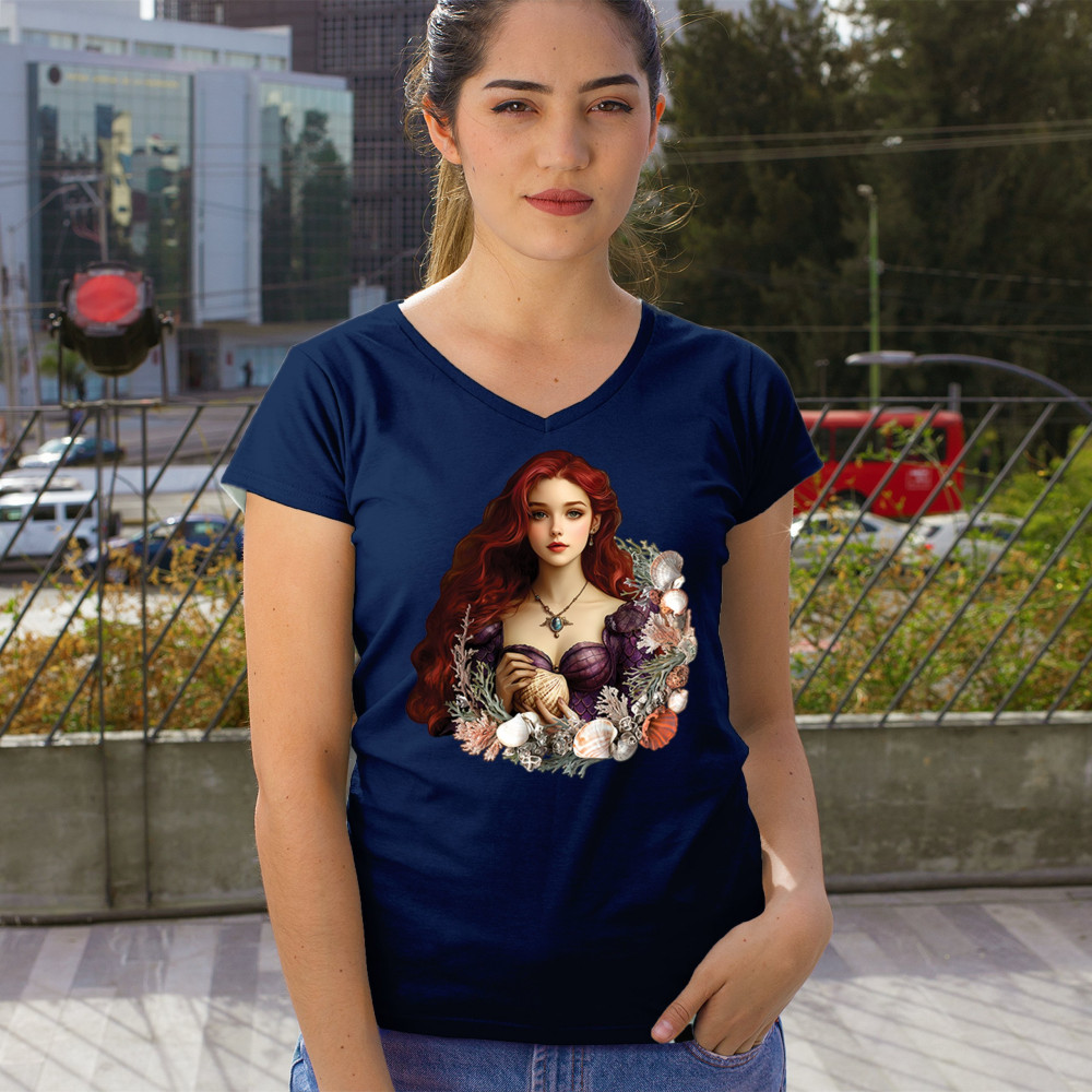 Fantasy mermaid design with red-haired girl, seashell dress, coral, and sea life. A dreamy tribute to marine magic and coastal fairytales.