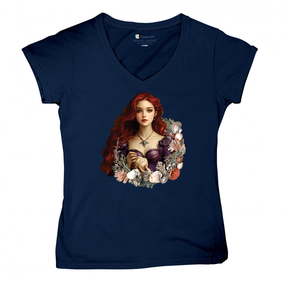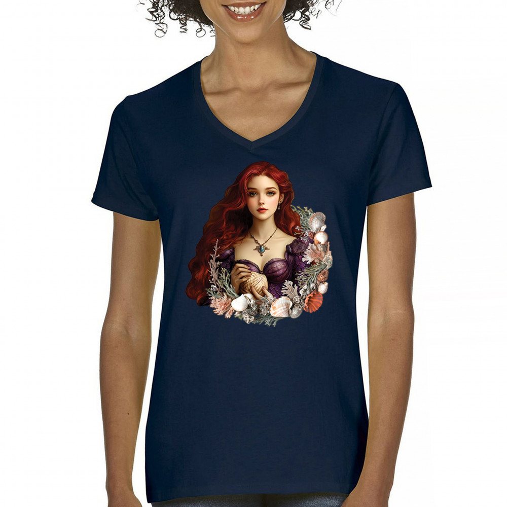 Inspired by mystical ocean themes, this design features a fantasy red-haired girl in a seashell dress, cradling a large shell. She is framed by coral, seaweed, and a shimmering array of ocean shells. With nods to classic mermaid lore and fairytale storytelling, it's perfect for fans of fantasy creatures, marine magic, and romantic ocean legends.