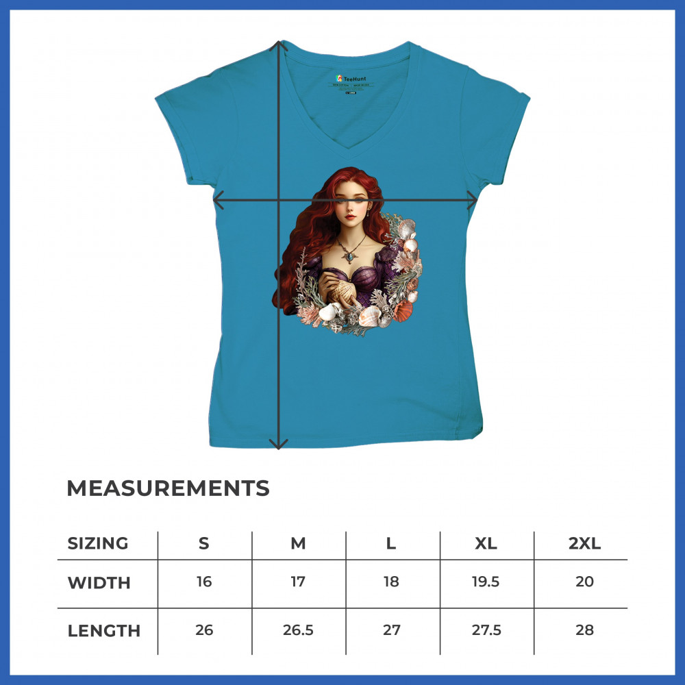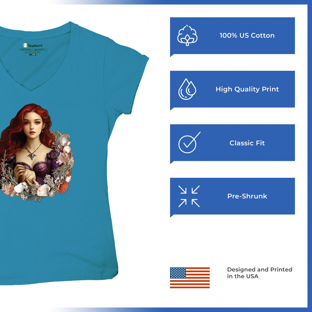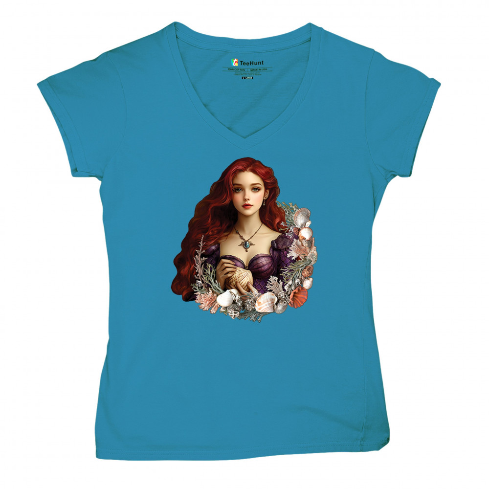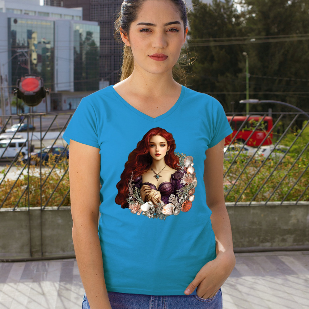 Fantasy mermaid design with red-haired girl, seashell dress, coral, and sea life. A dreamy tribute to marine magic and coastal fairytales.